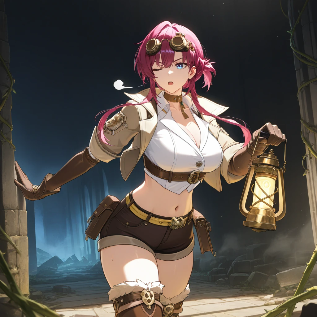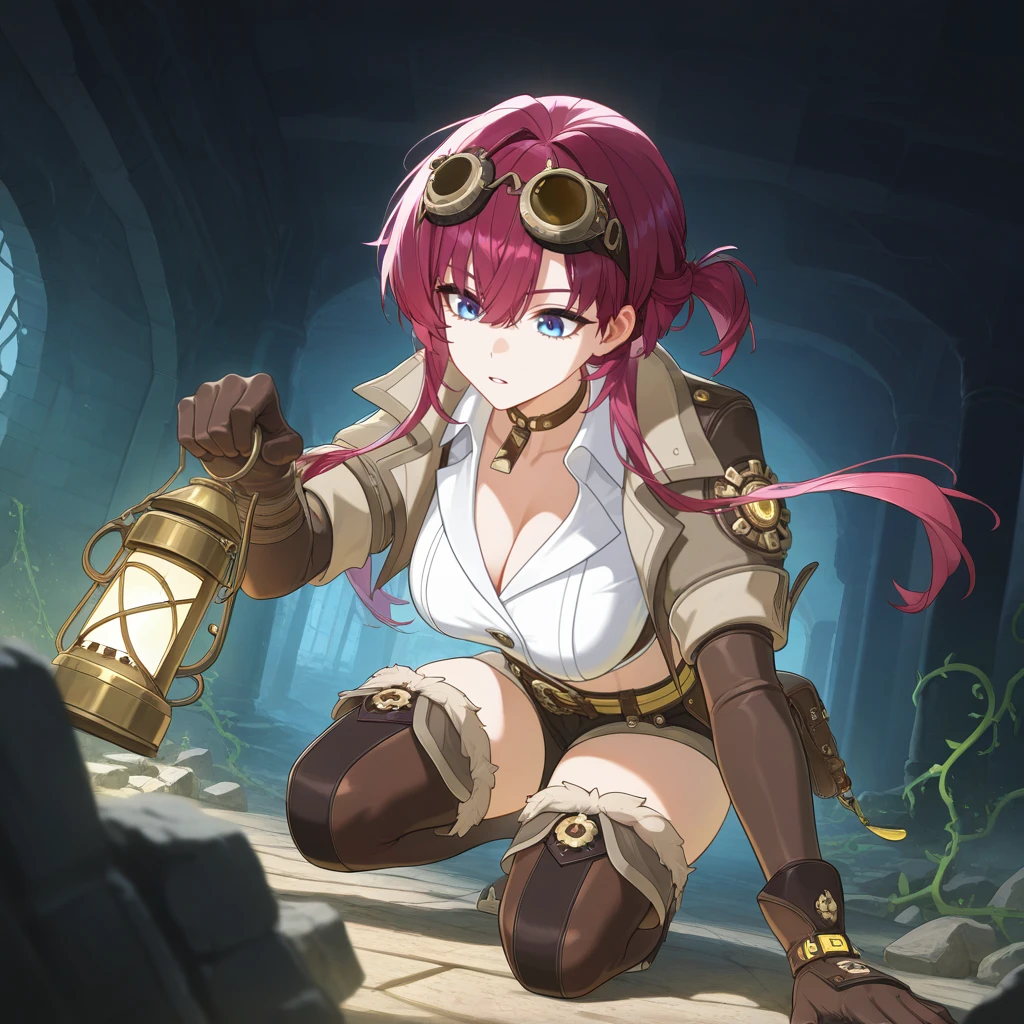 LeonaStrv, Lna_Adv, short hair with long locks, red hair, purple hair, blue eyes, round eyewear, goggles, goggles on head, cropped shirt, collared shirt, white shirt, cleavage cutout, brown belt, underbust, midriff, navel, yellow belt, collarbone, crossed belts, buckle, gears, belt pouch, short shorts, dark brown shorts, alt cropped jacket, light brown jacket, brown choker, elbow gloves, brown gloves, wrist strap, thigh boots, brown footwear, fur-trimmed footwear,Chinese Outfit: