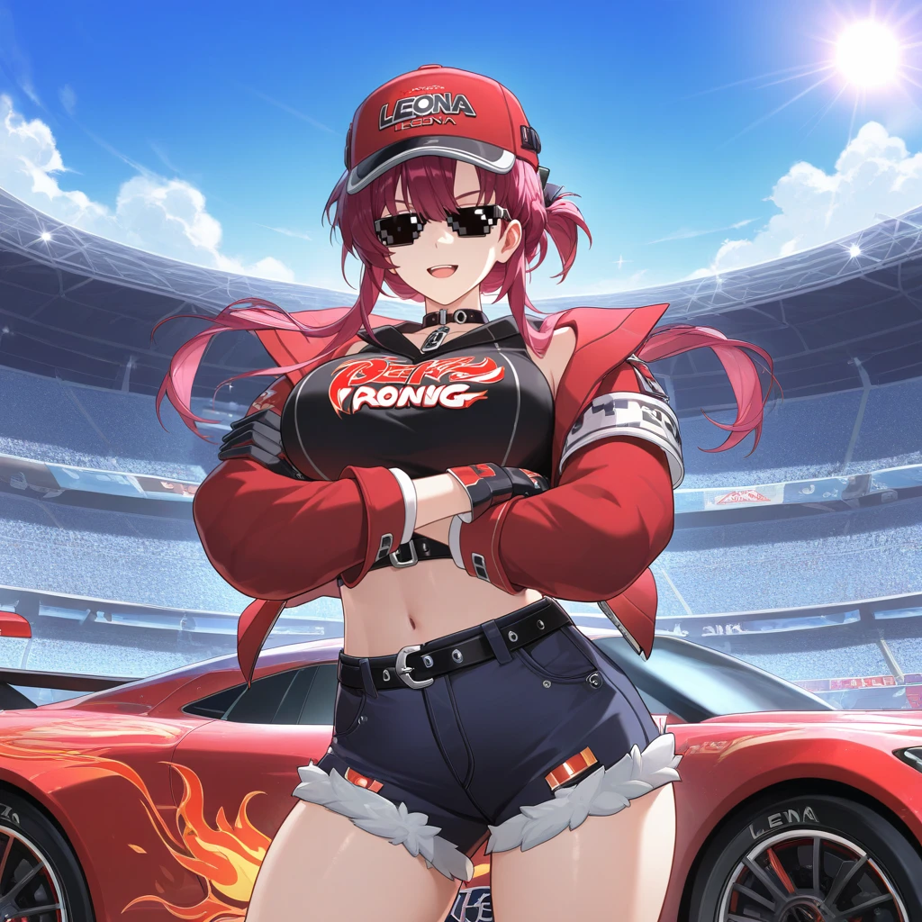 LeonaStrv, Lna_Gmr, short hair with long locks, red hair, purple hair, blue eyes, red jacket, jacket, partially open jacket, red headwear, white socks, red footwear, sneakers, cap, sunglasses, pendant choker, black shirt, crop top, sleeveless shirt, black belt, underbust, midriff, navel, puffy sleeves, red sleeves, fire print, black ribbon, fur-trimmed shorts, denim shorts, dark blue shorts, thigh belt, white armband, red sleeve cuffs, black gloves, gloves,The results of your generations are dependent on the additional LoRAs, weights, and models you use, so it may not work or come out as consistent as my sample images.