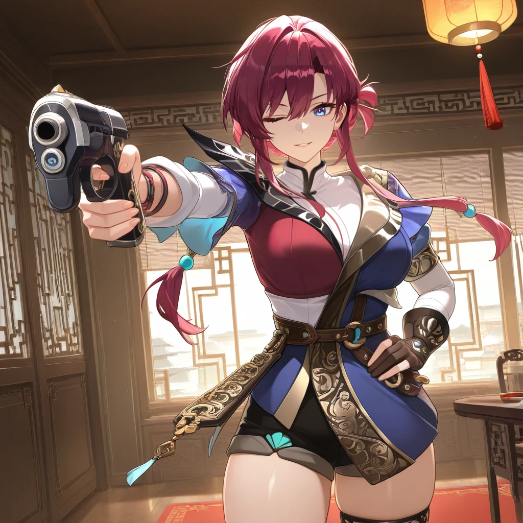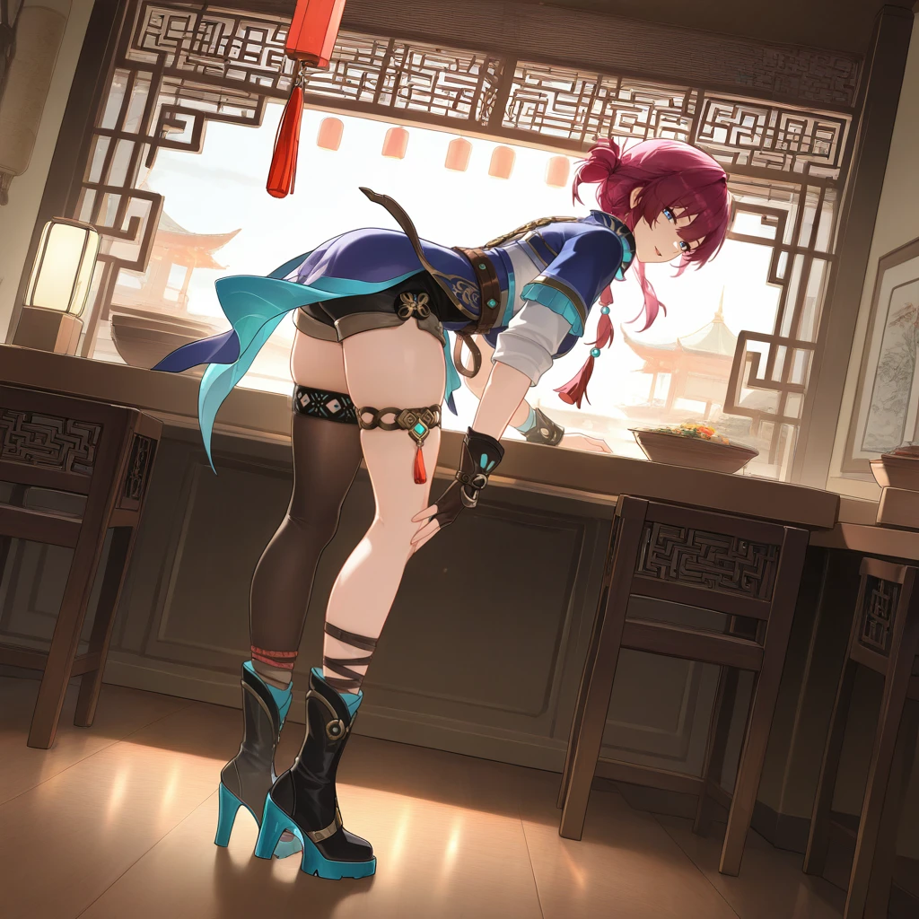 LeonaStrv, Lna_CN, short hair with long locks, red hair, purple hair, blue eyes, chinese clothes, two-tone clothes, short dress, blue dress, red dress, two-tone dress, shirt under dress, white shirt, shirt, asymmetrical clothes, white sleeves, uneven sleeves, blue sleeves, red sleeves, single thighhigh, brown thighhighs, asymmetrical legwear, thighlet, layered sleeves, single fingerless glove, dark brown glove, wristband, shorts under dress, black shorts, short shorts, loose belt, brown belt, gold trim, high heel boots, black boots,Dimension Deputy Outfit: