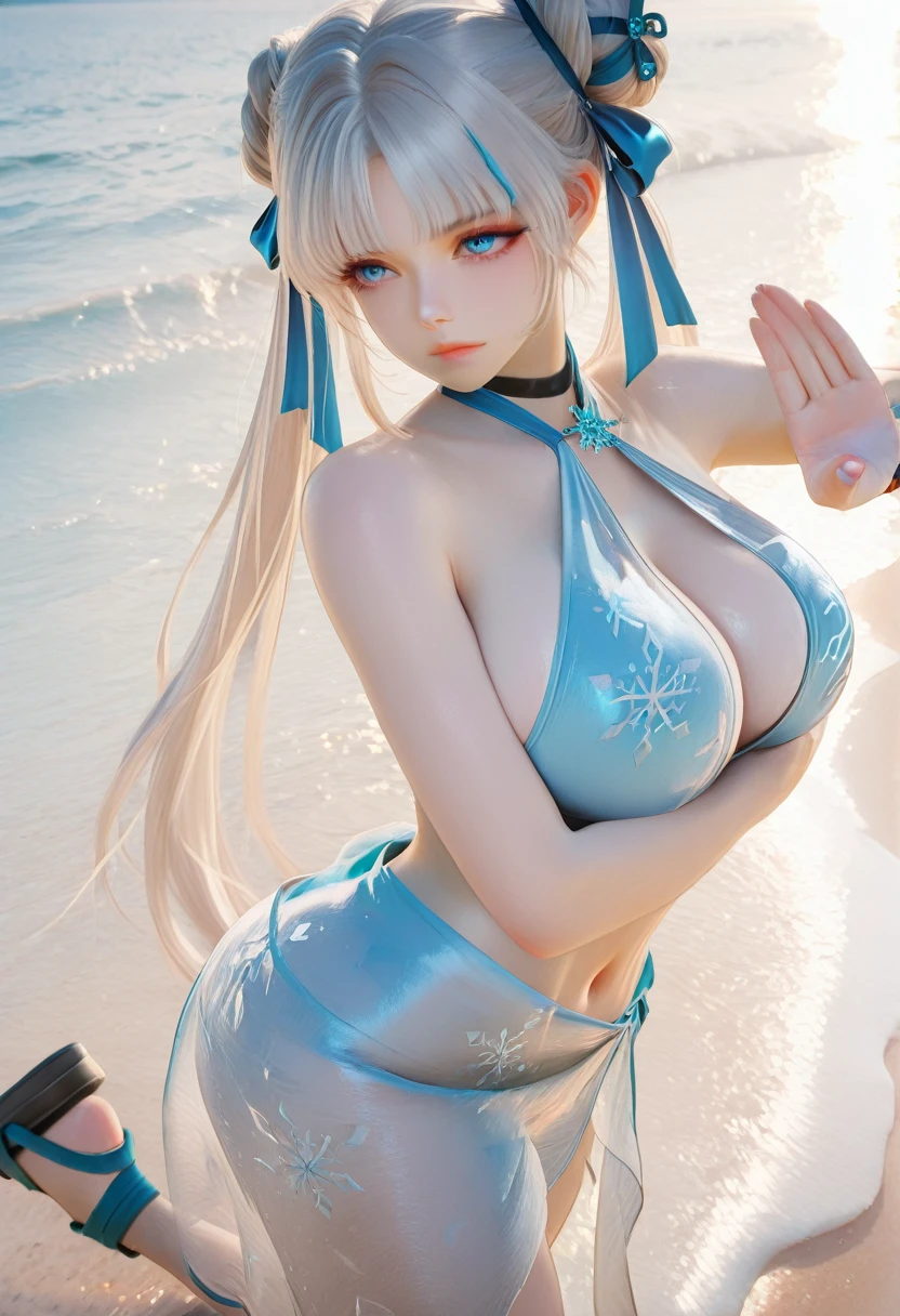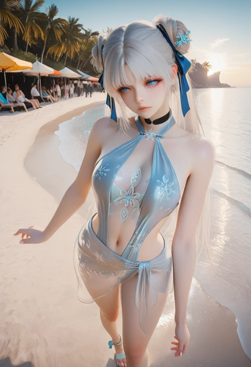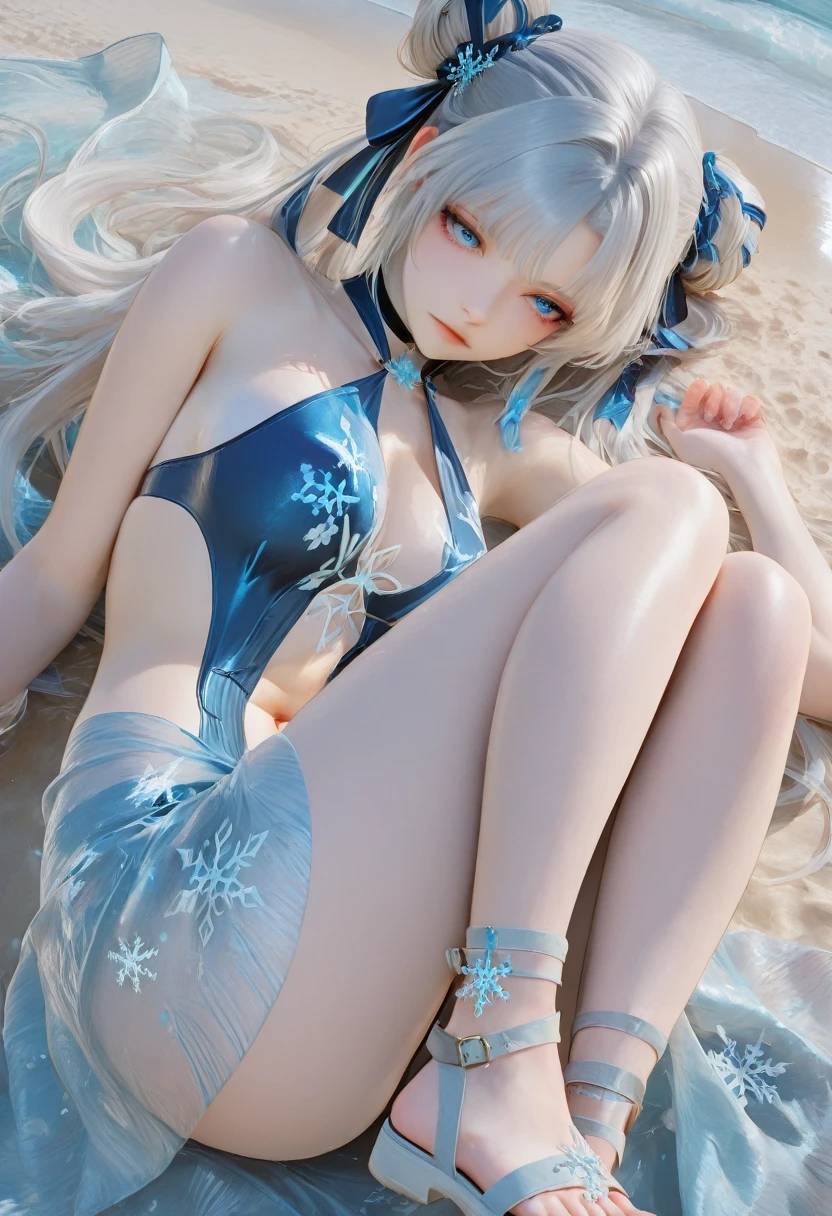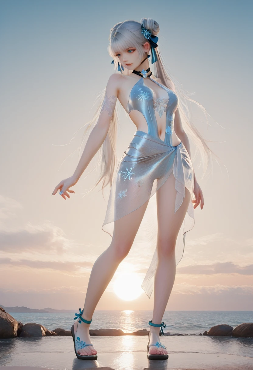 Gu Qinghan,navel,swimsuit,ribbon,sandals,jewelry,choker,halterneck,sarong,see-through,snowflake print,