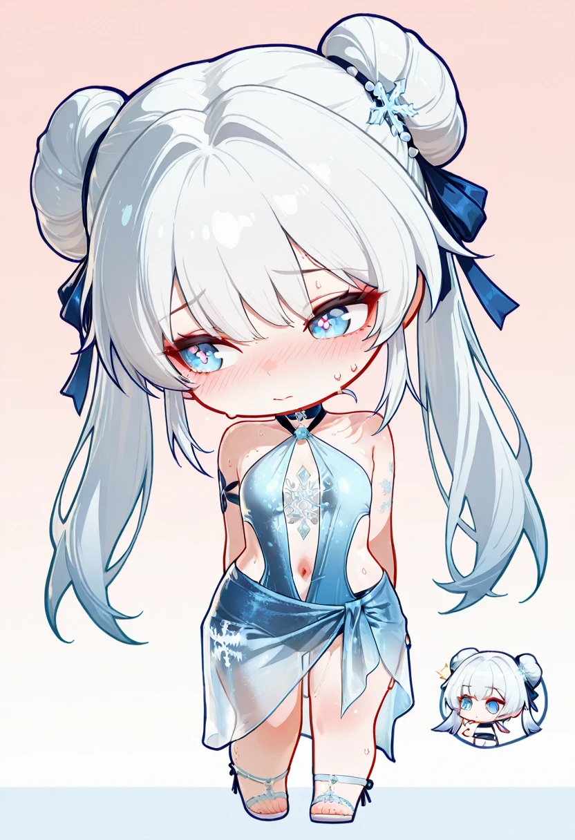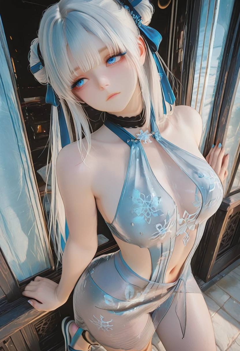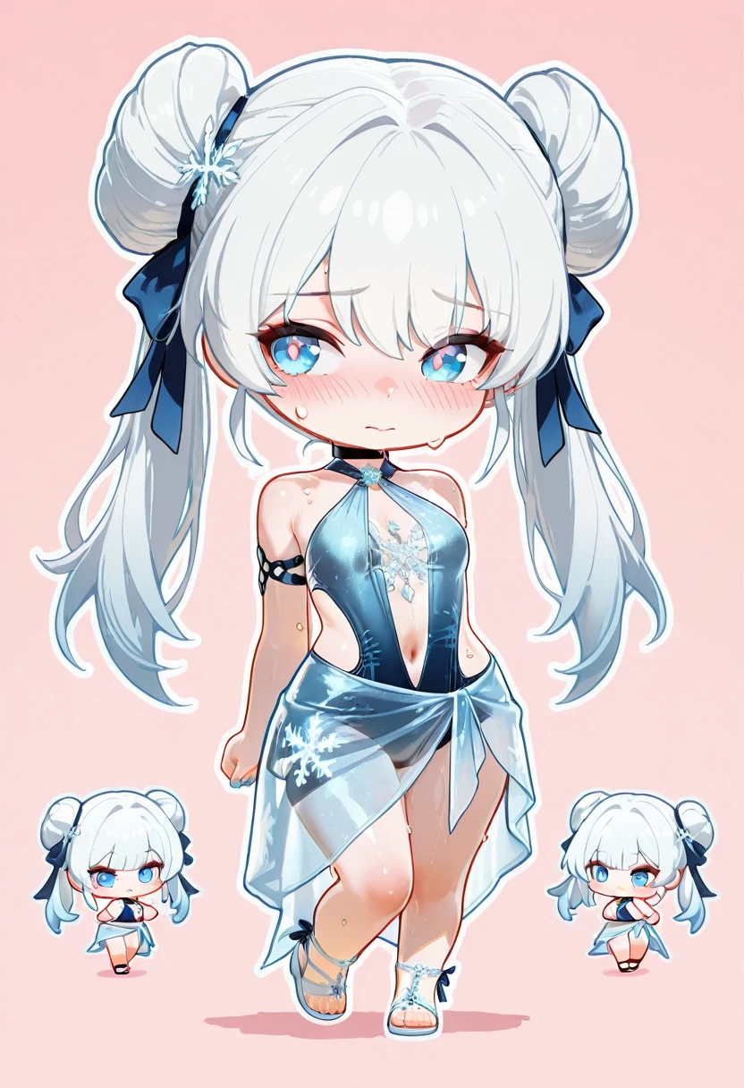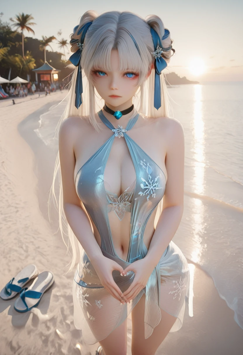 Gu Qinghan,navel,swimsuit,ribbon,sandals,jewelry,choker,halterneck,sarong,see-through,snowflake print,