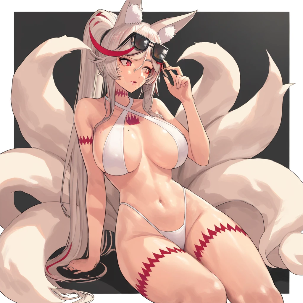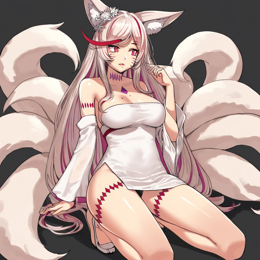 red eyes, white hair, red hair, streaked hair, multicolored hair, long hair, whisker markings, mole under mouth, neck tattoo, leg tattoo,