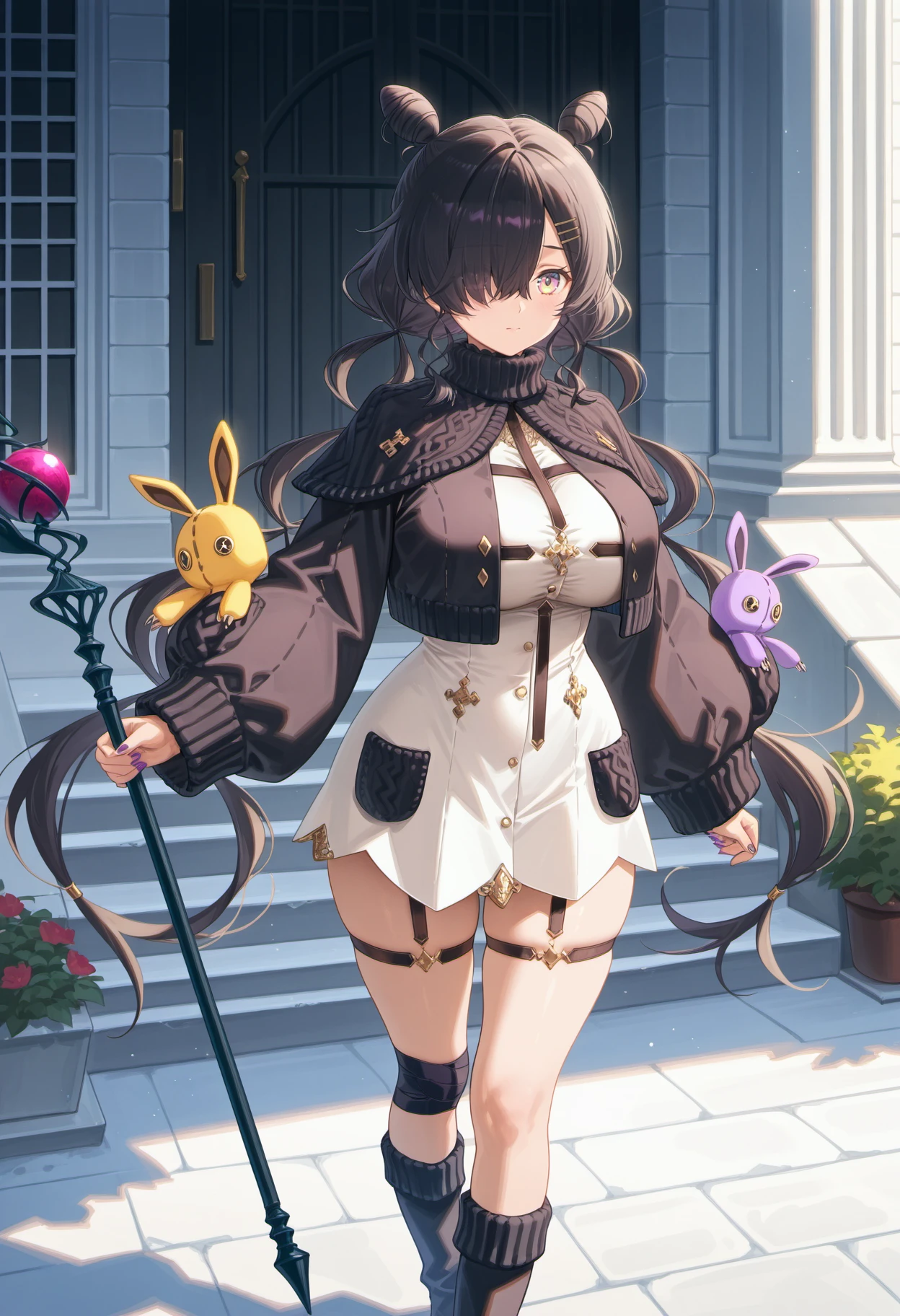 antjedef,black hair,very long hair,hair over one eye,cone hair bun,double bun,low twintails,hairclip,purple eyes,yellow pupil,multicolored eyes,large breasts,black jacket,turtleneck,puffy long sleeves,cropped jacket,open jacket,white dress,pocket,stuffed toy,stuffed animal,thigh strap with garter,wrap around knee,black footwear,nail polish,purple nails,
