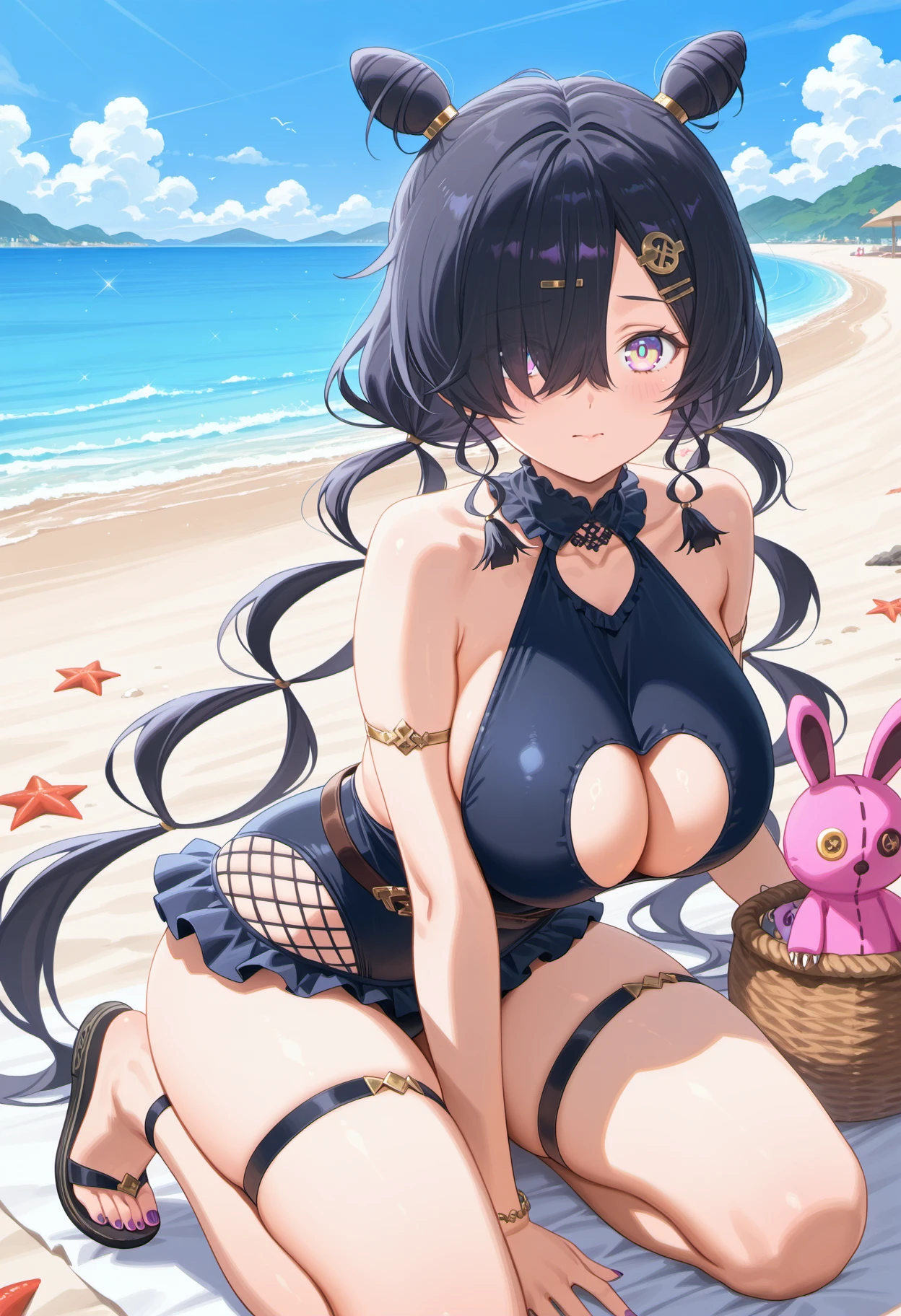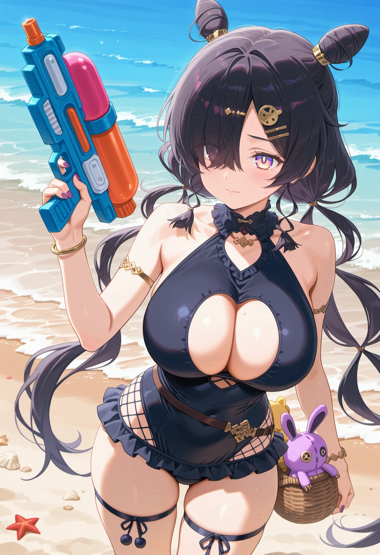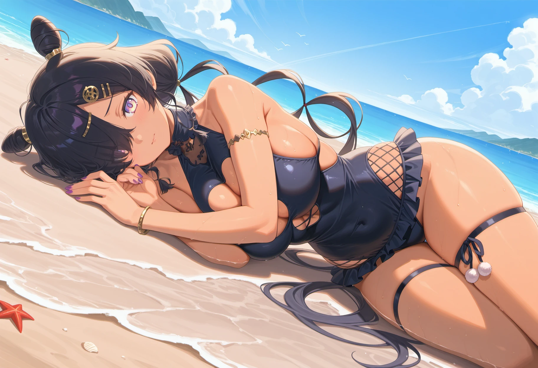 antjeswim,black hair,very long hair,hair over one eye,cone hair bun,double bun,low twintails,hair ornament,purple eyes,yellow pupil,multicolored eyes,large breasts,black one-piece swimsuit,collar,cleavage cutout,fishnets,frills,armlet,bracelet,nail polish,purple nails,