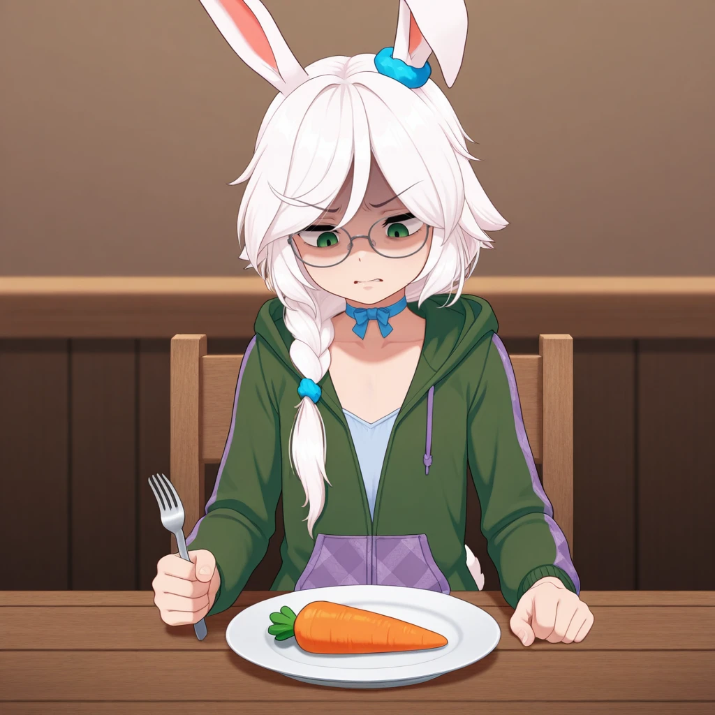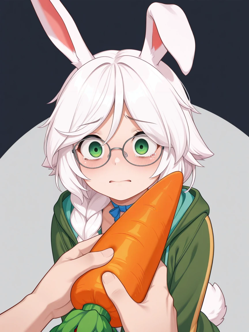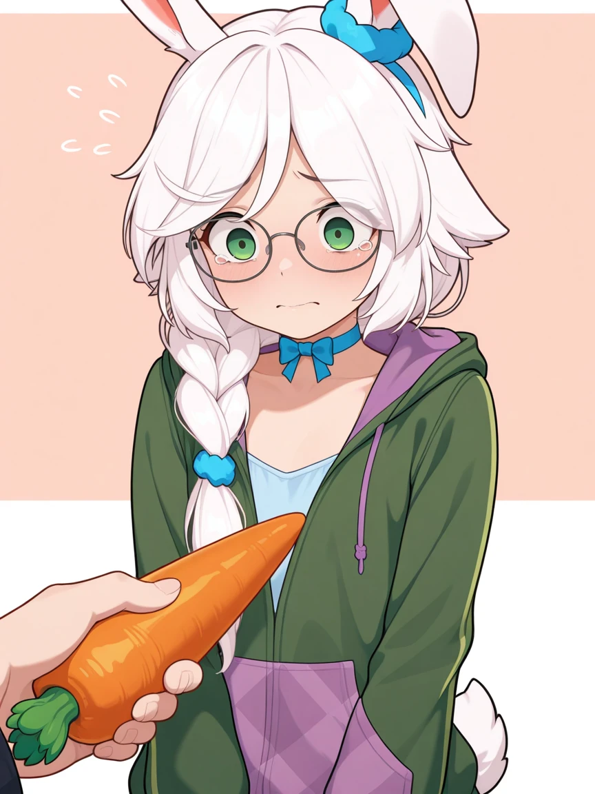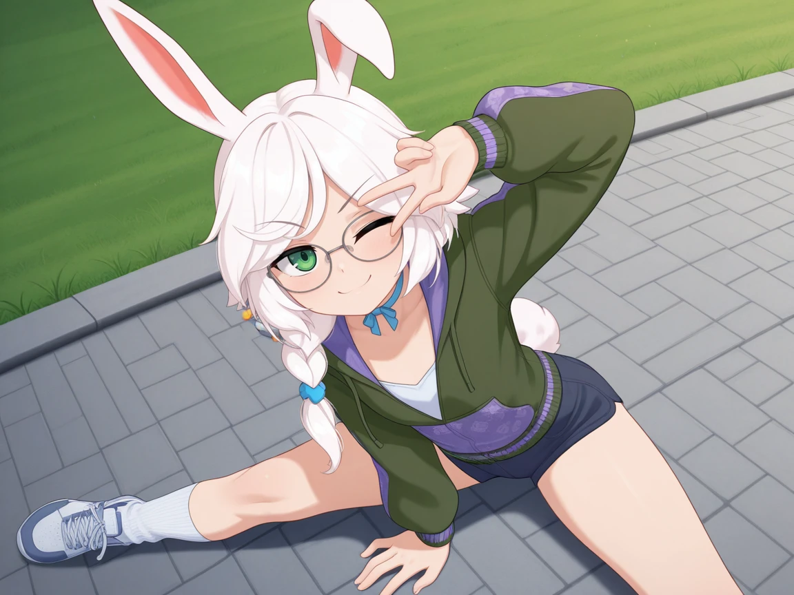 animal ears, rabbit ears, glasses, green eyes, white hair, braid, hair scrunchie, rabbit tail, blue ribbon choker, flat chest, hoodie, green jacket, shorts, white socks, sneakers,I also suggest putting Extra Ears in the negs and using ADetailer is recommended.