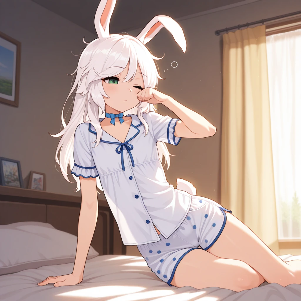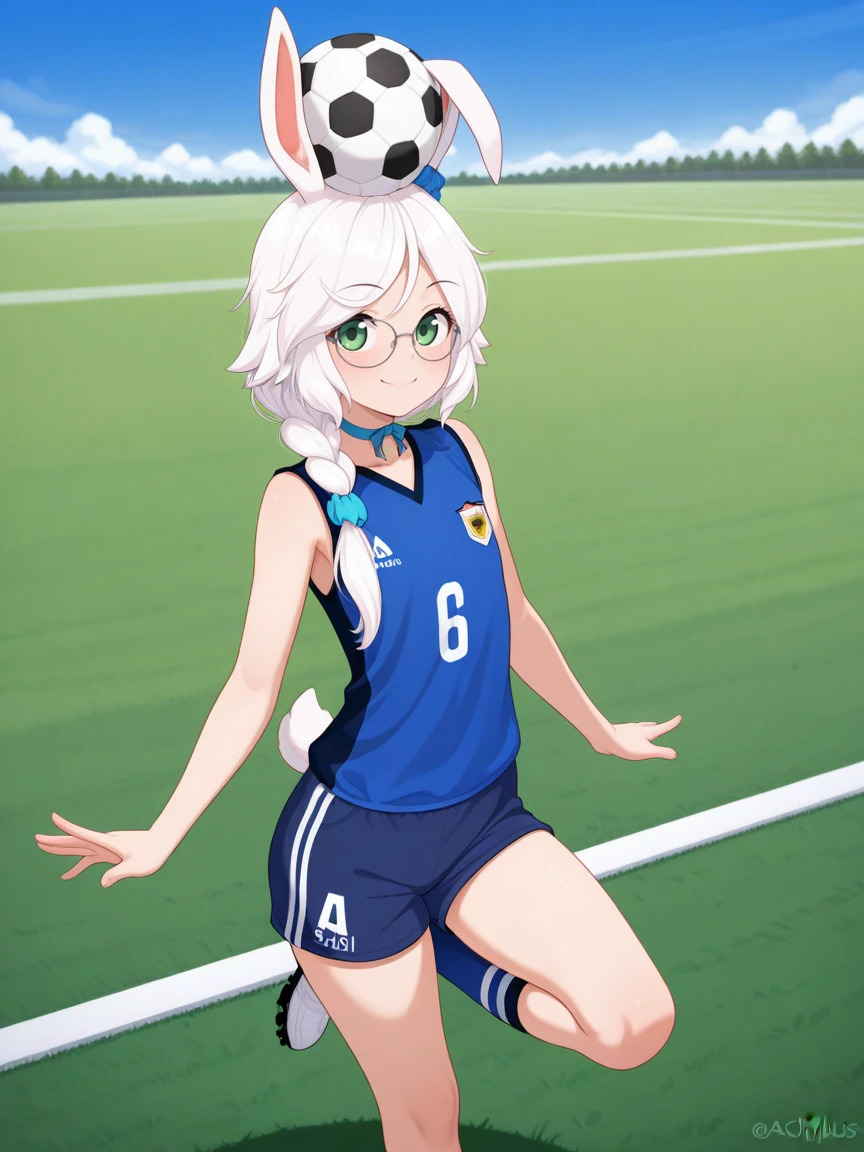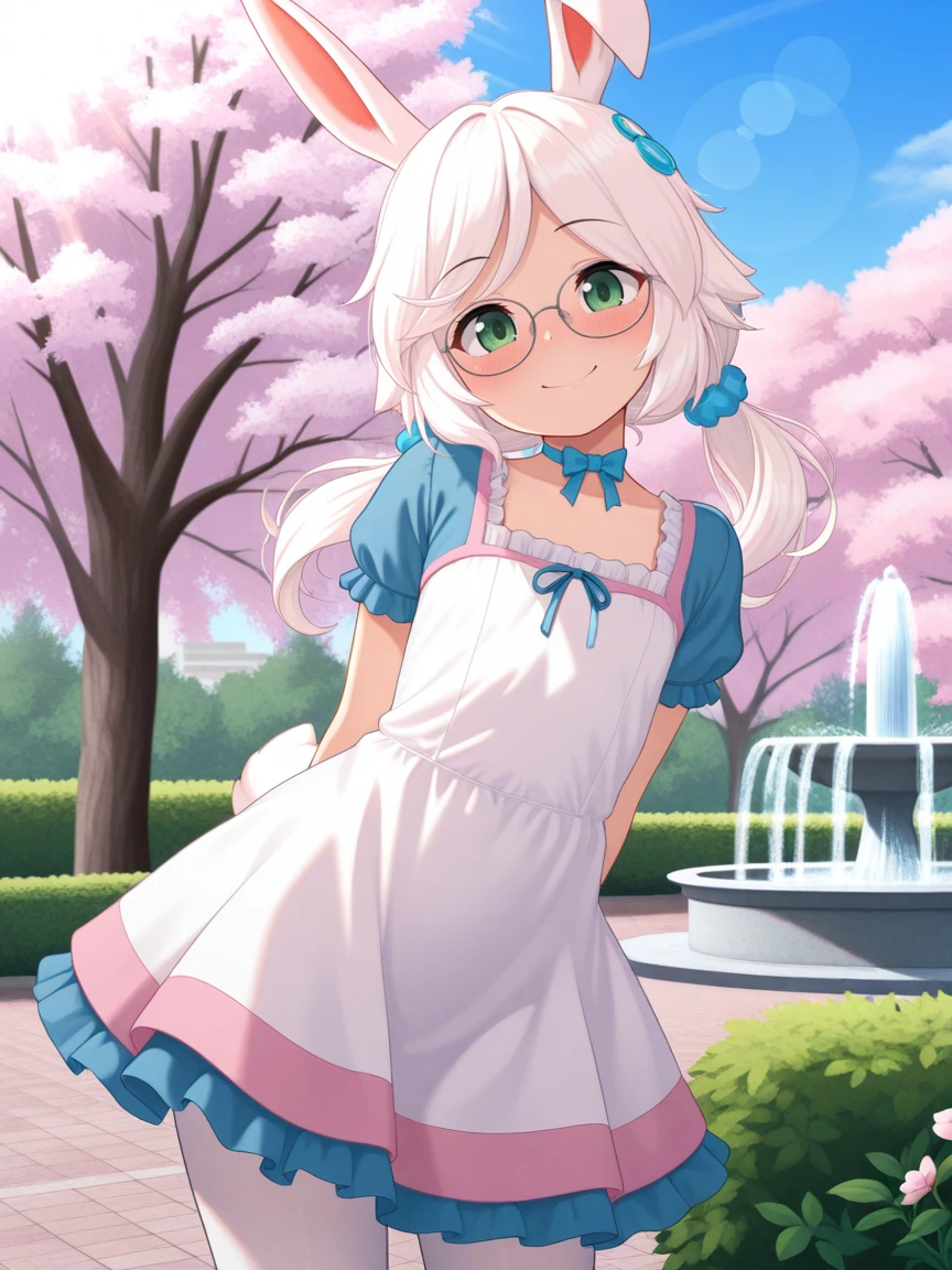 animal ears, rabbit ears, glasses, green eyes, white hair, braid, hair scrunchie, rabbit tail, blue ribbon choker, flat chest, hoodie, green jacket, shorts, white socks, sneakers,I also suggest putting Extra Ears in the negs and using ADetailer is recommended.