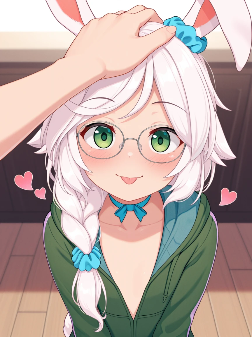 charlieillus, animal ears, rabbit ears, glasses, green eyes, white hair, braid, hair scrunchie, rabbit tail, blue ribbon choker, flat chest, hoodie, green jacket, shorts, white socks, sneakers,