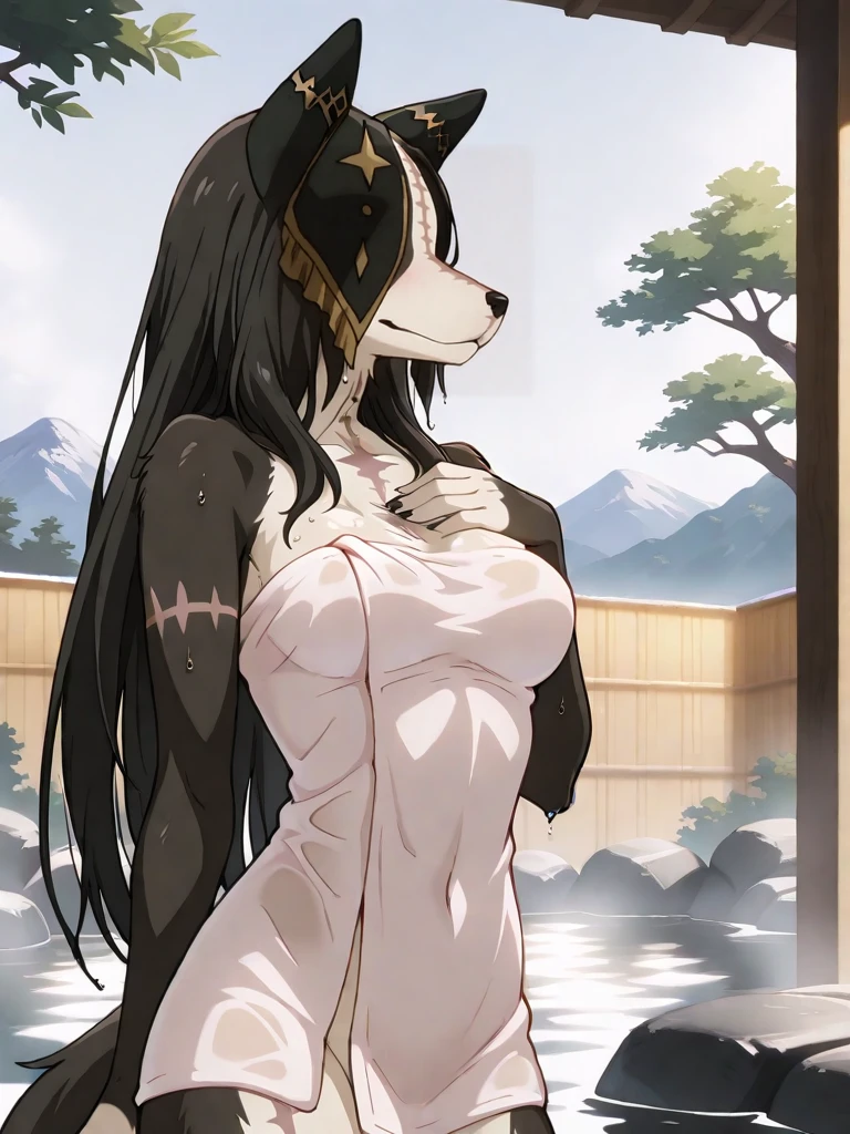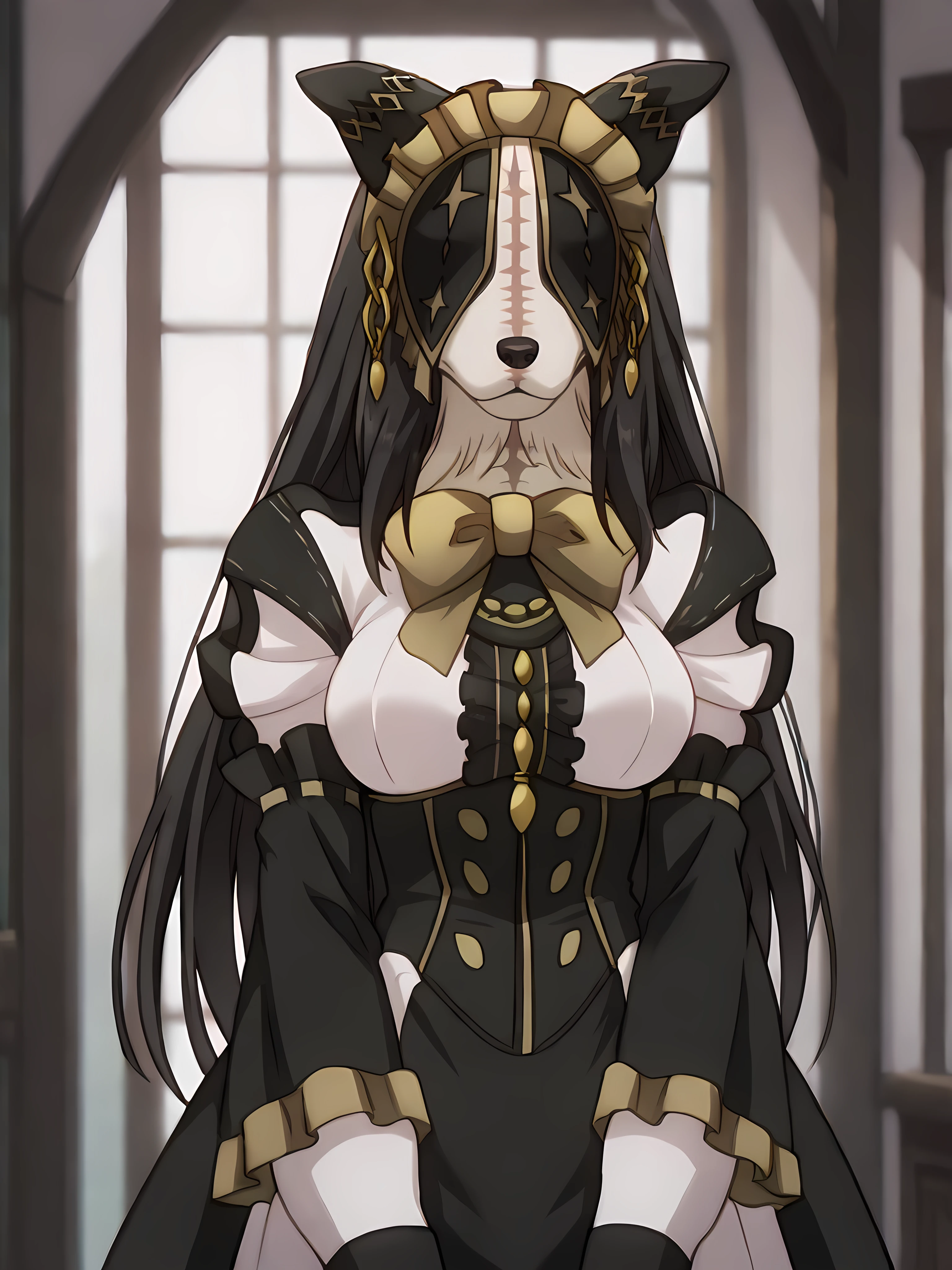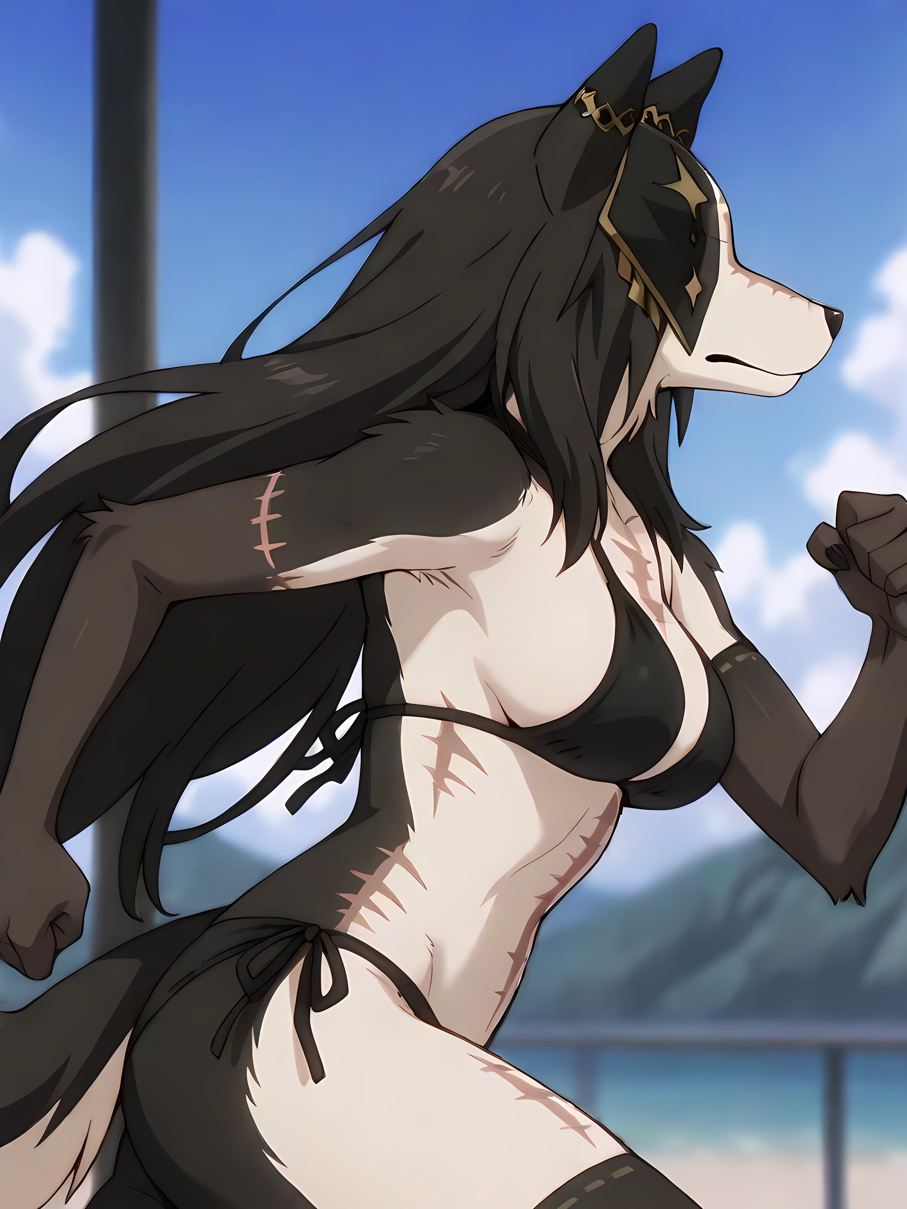 pestonya, black long hair, dog girl, dog ears, stitches, no humans, furry,