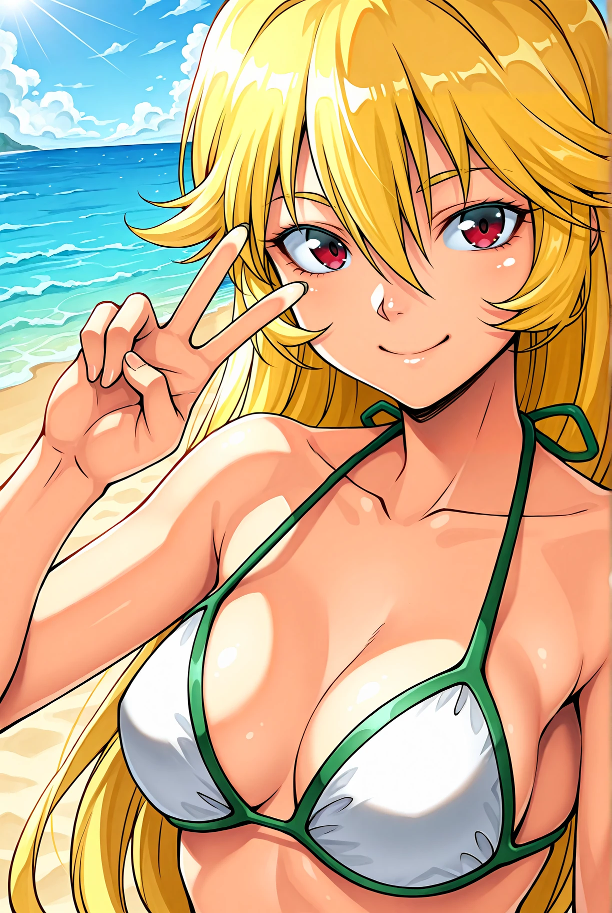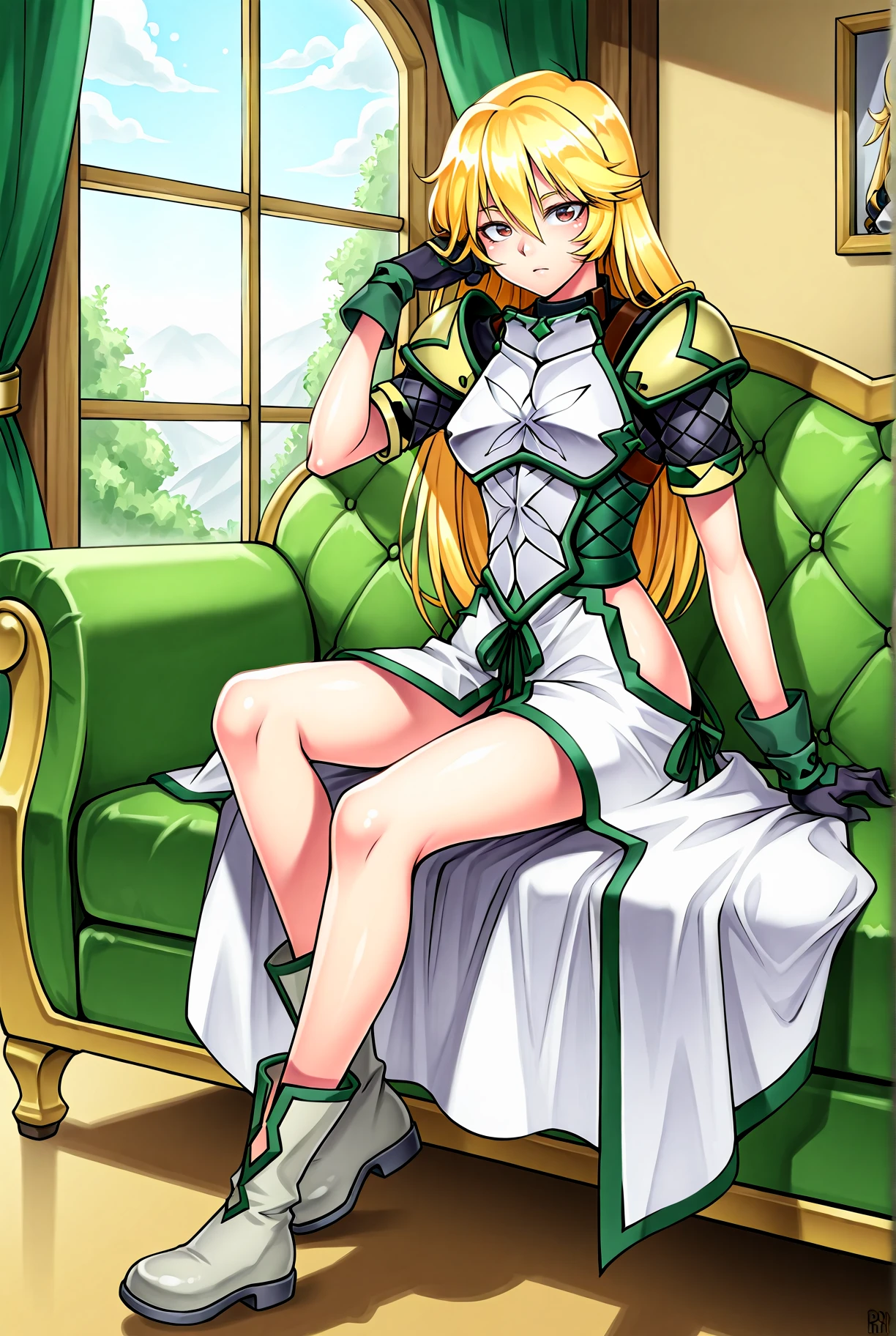 1girl, g4rdinia, solo, blonde hair, long hair, g4rdinia_armor, gloves, dress, boots, brown eyes