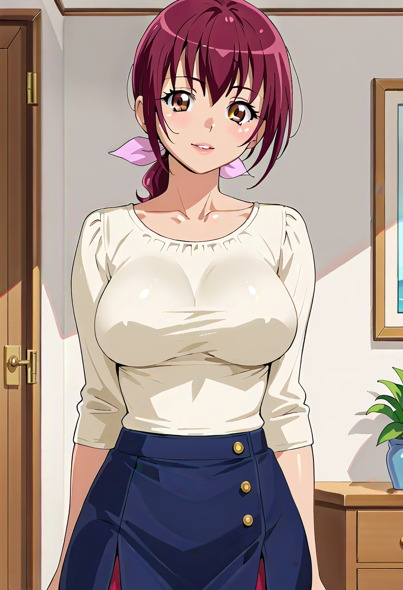hoshizora_ikuyo, large breasts, ponytail, hair ribbon, purple hair female, shirt, pants, apron,