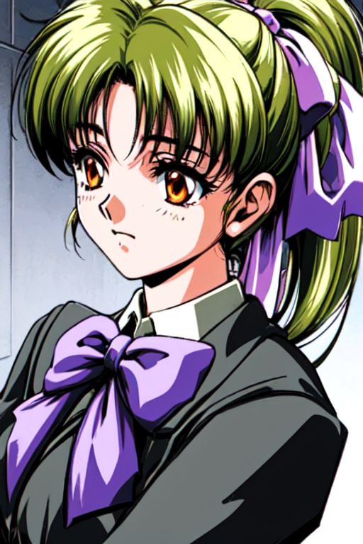 sakisakamayu,solo,blue schoolgirl uniform, green blondehair, ponytail, hairbow, orange eyes, , 1990s , cel artstyle
