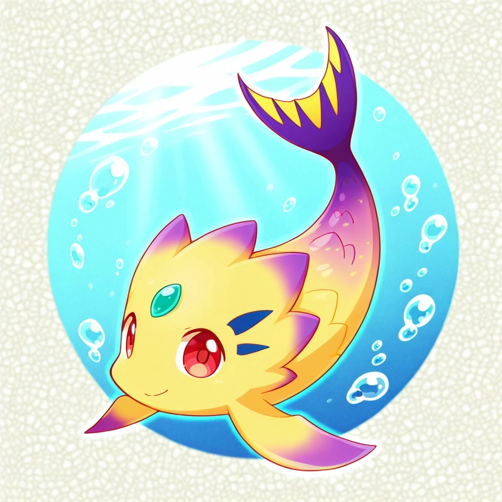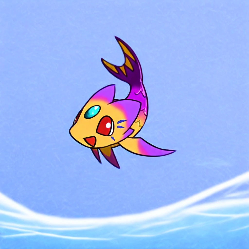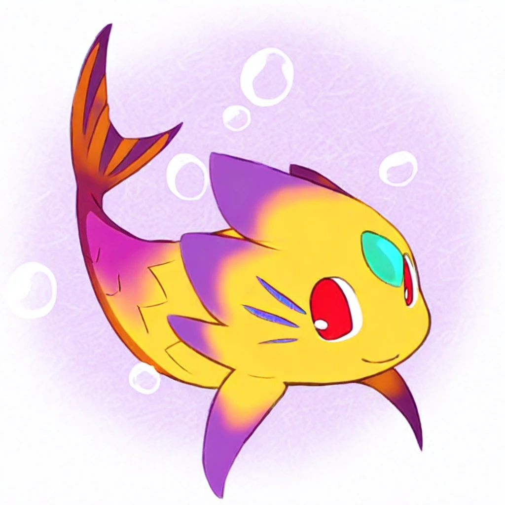 yellow and purple scales, red eyes, turquoise forehead jewel, blue facial marks, fish fins, purple tail fin,