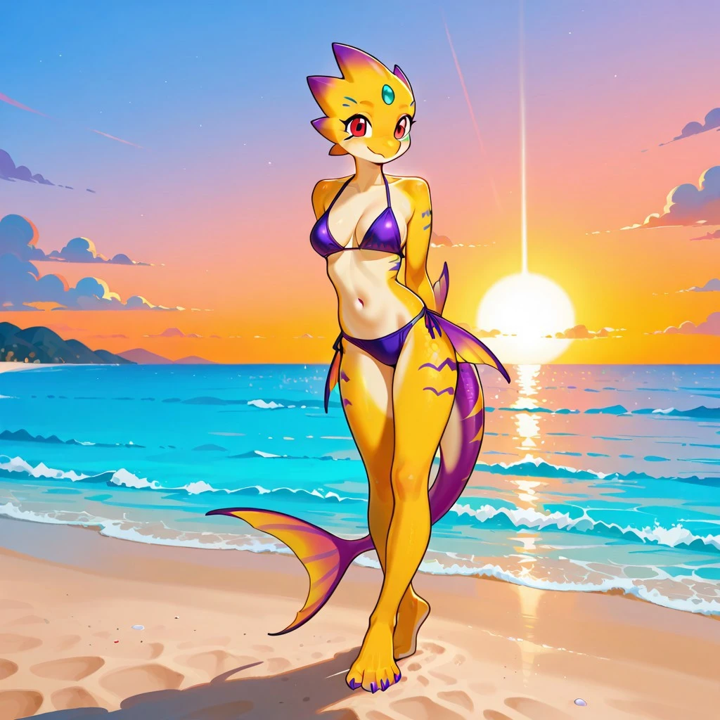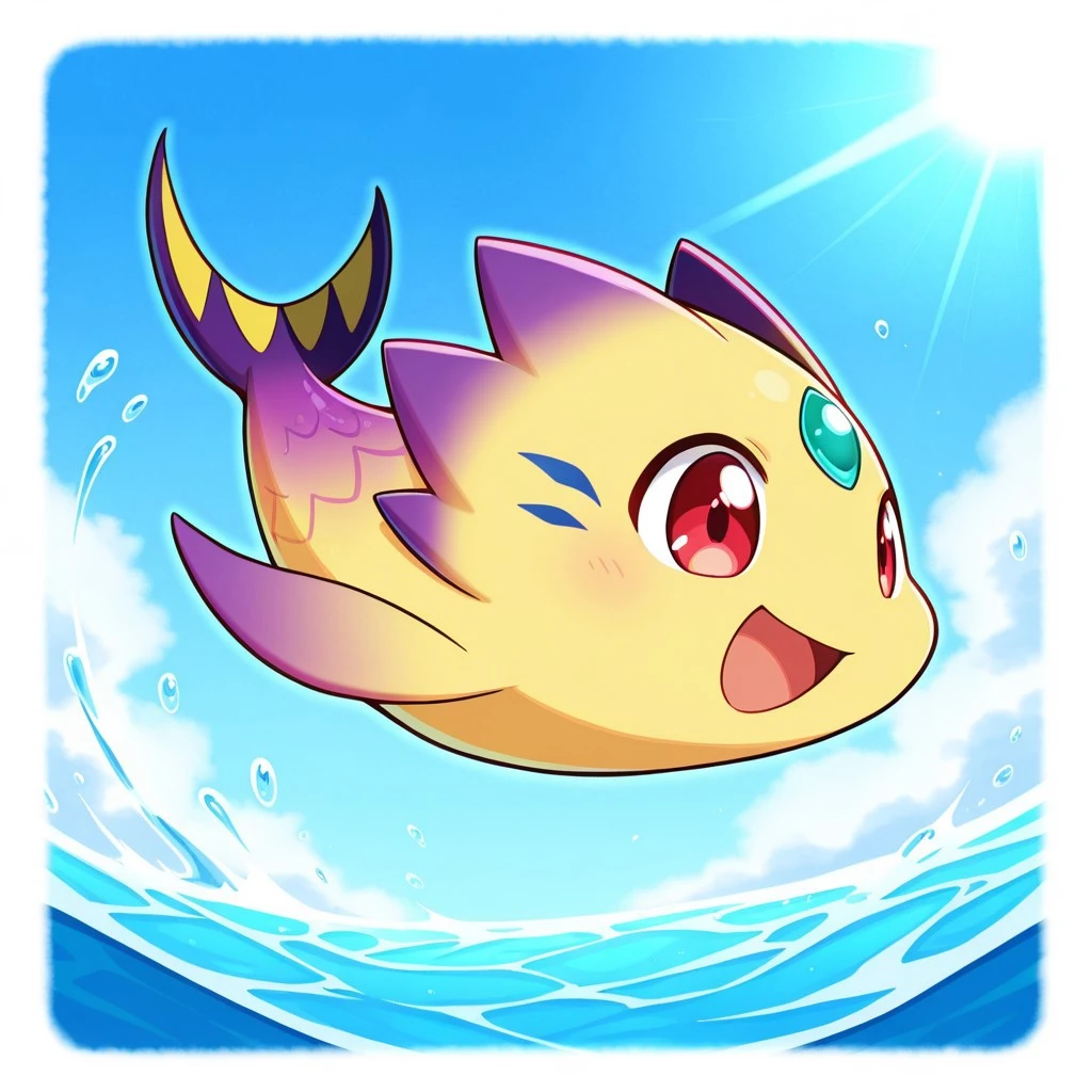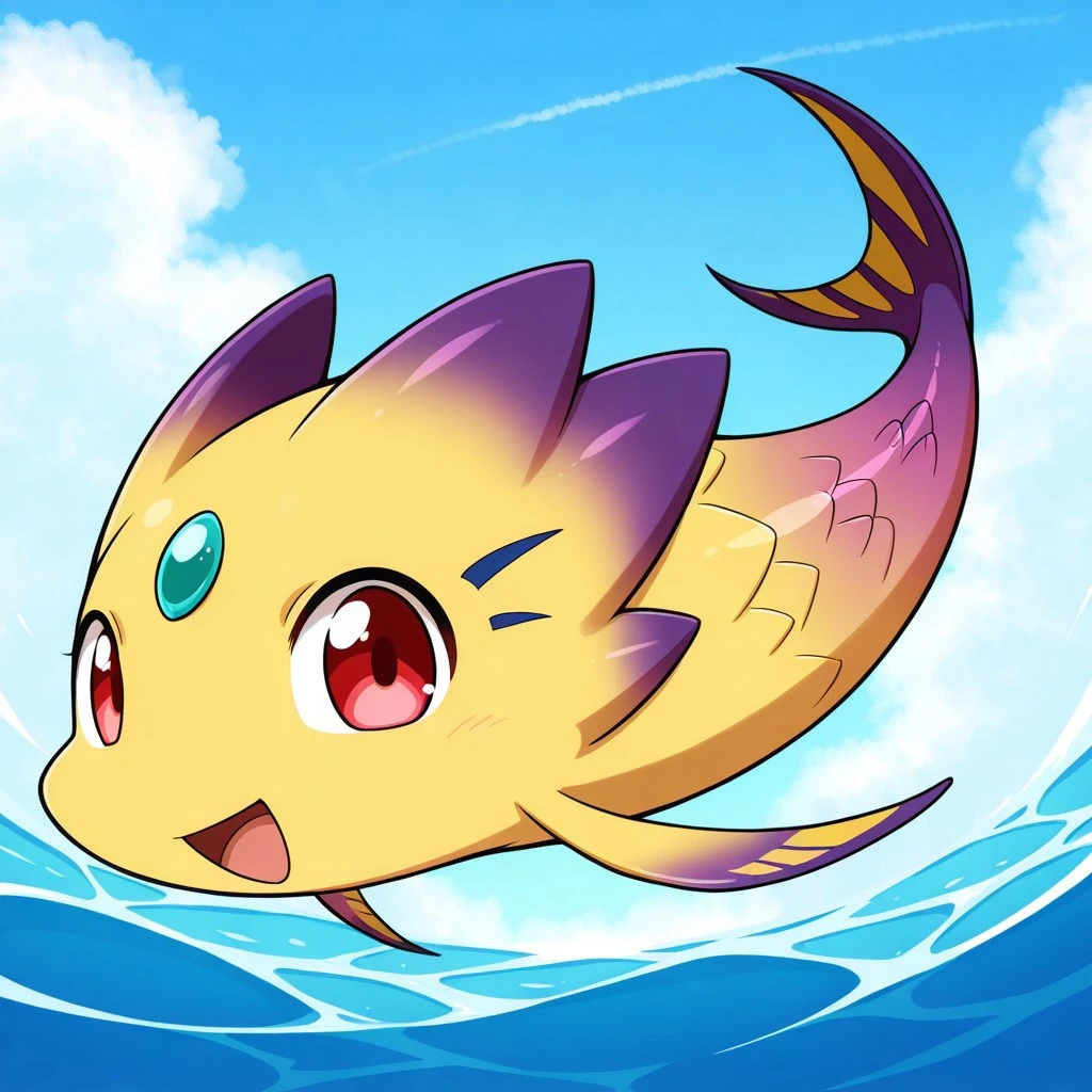 yellow and purple scales, red eyes, turquoise forehead jewel, blue facial marks, fish fins, purple tail fin,
