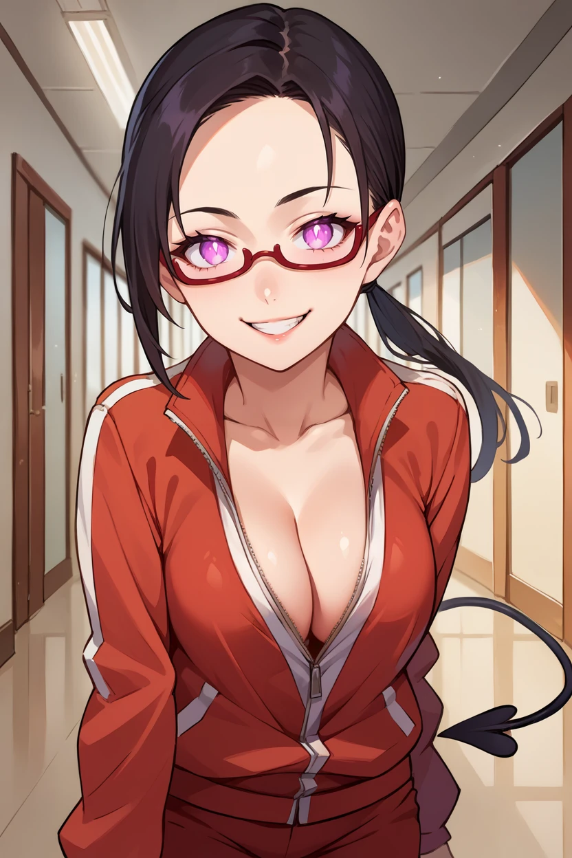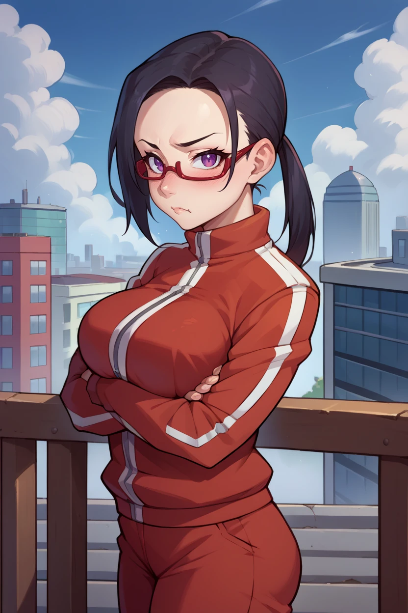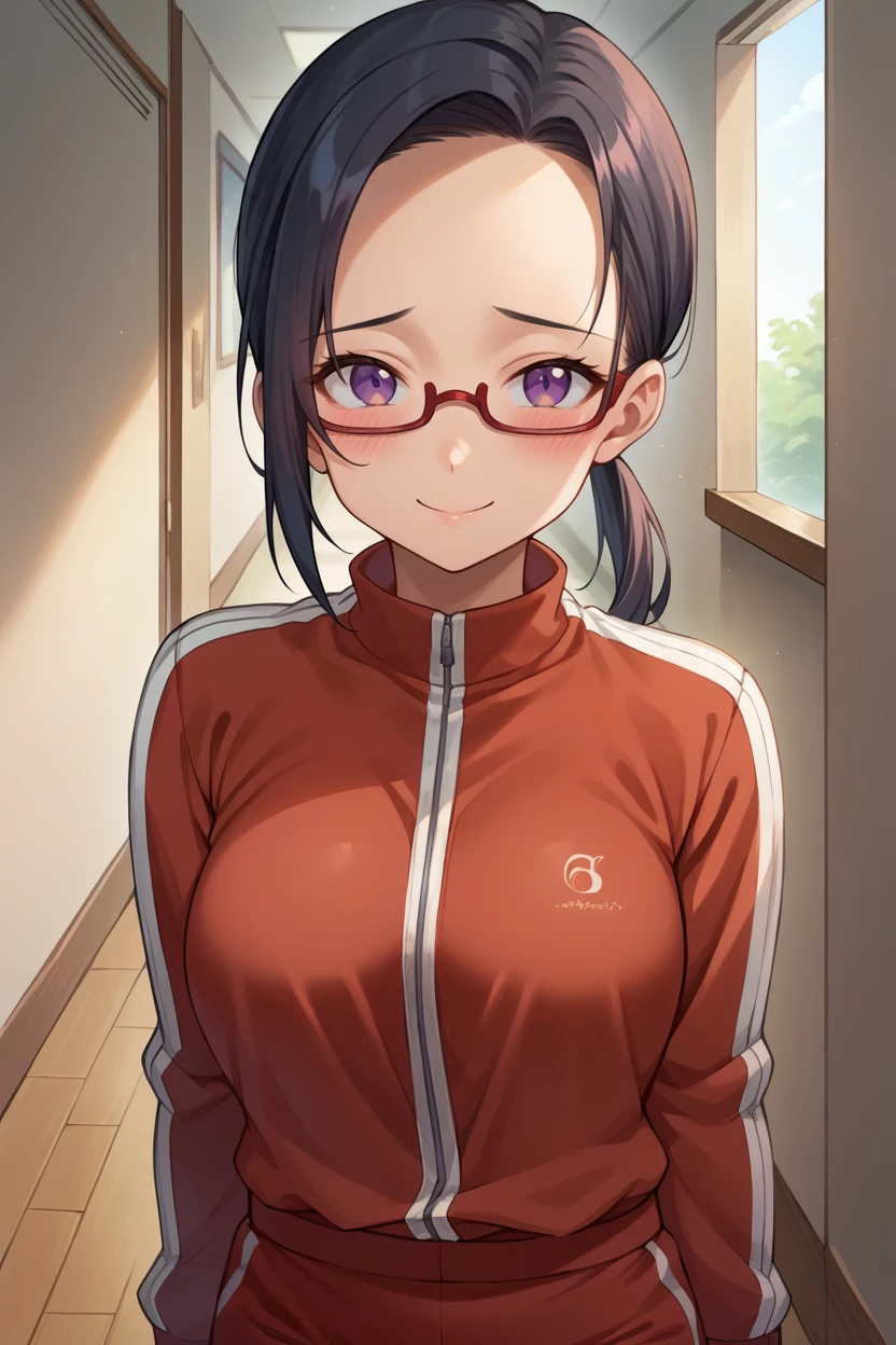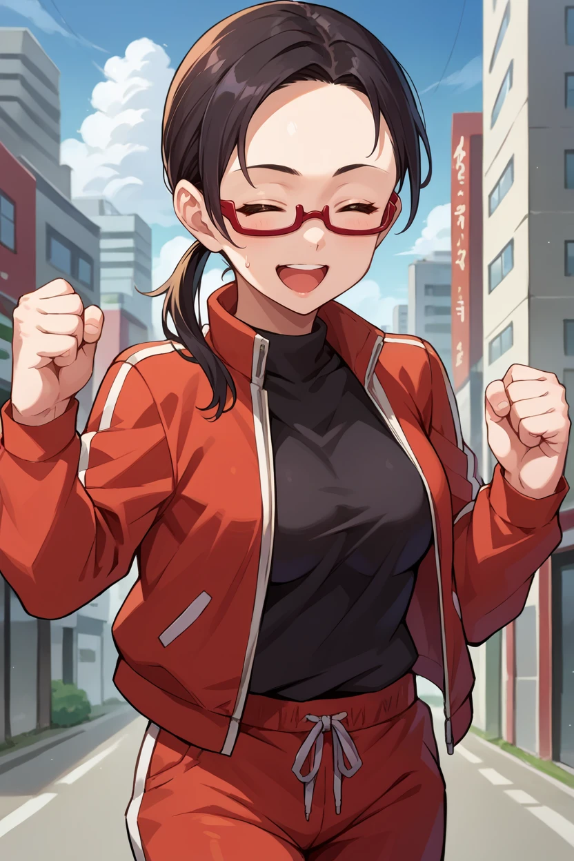 Add "glasses, red track jacket, closed jacket, red pants" for her typical look.