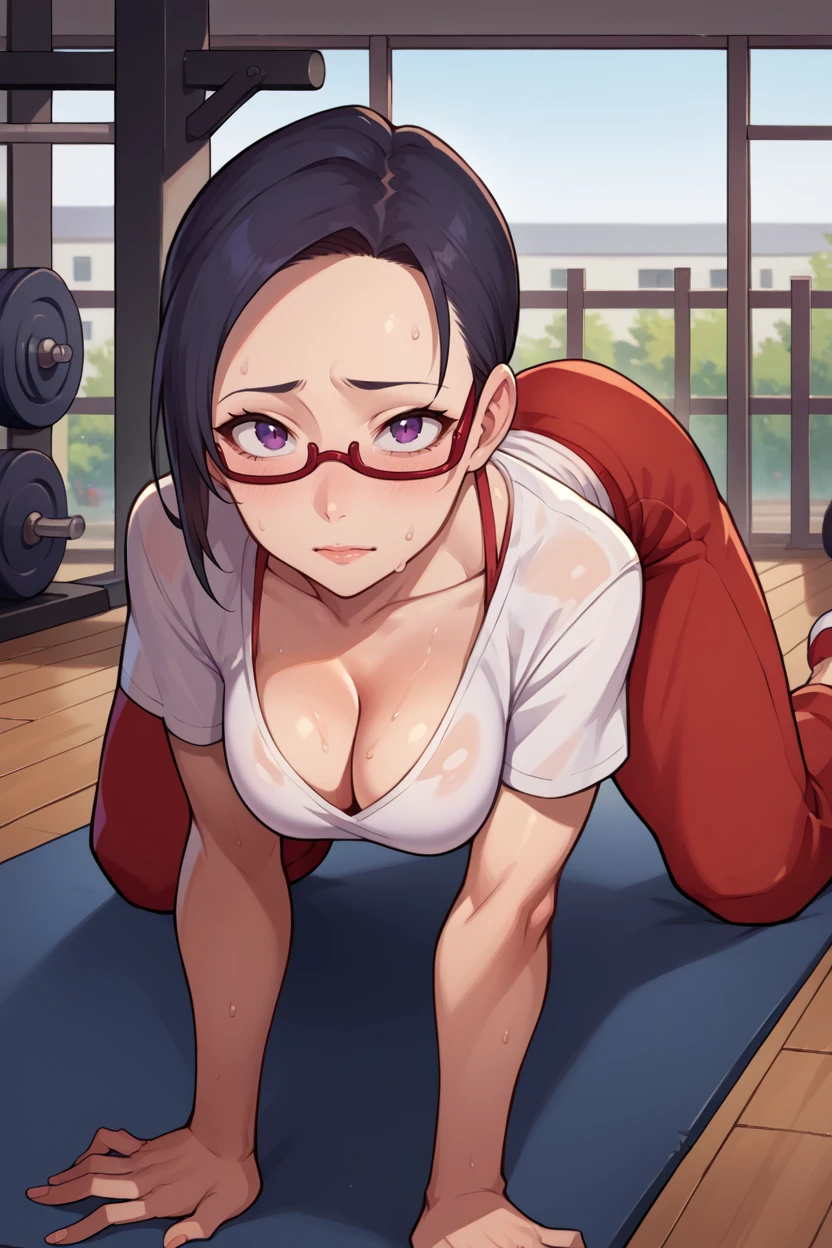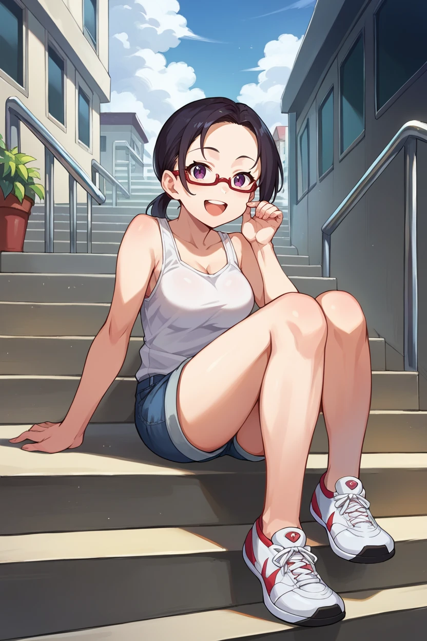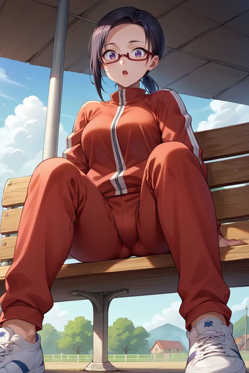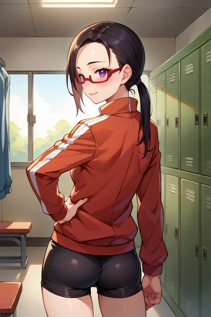 Add "glasses, red track jacket, closed jacket, red pants" for her typical look.