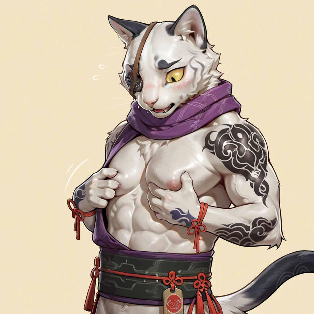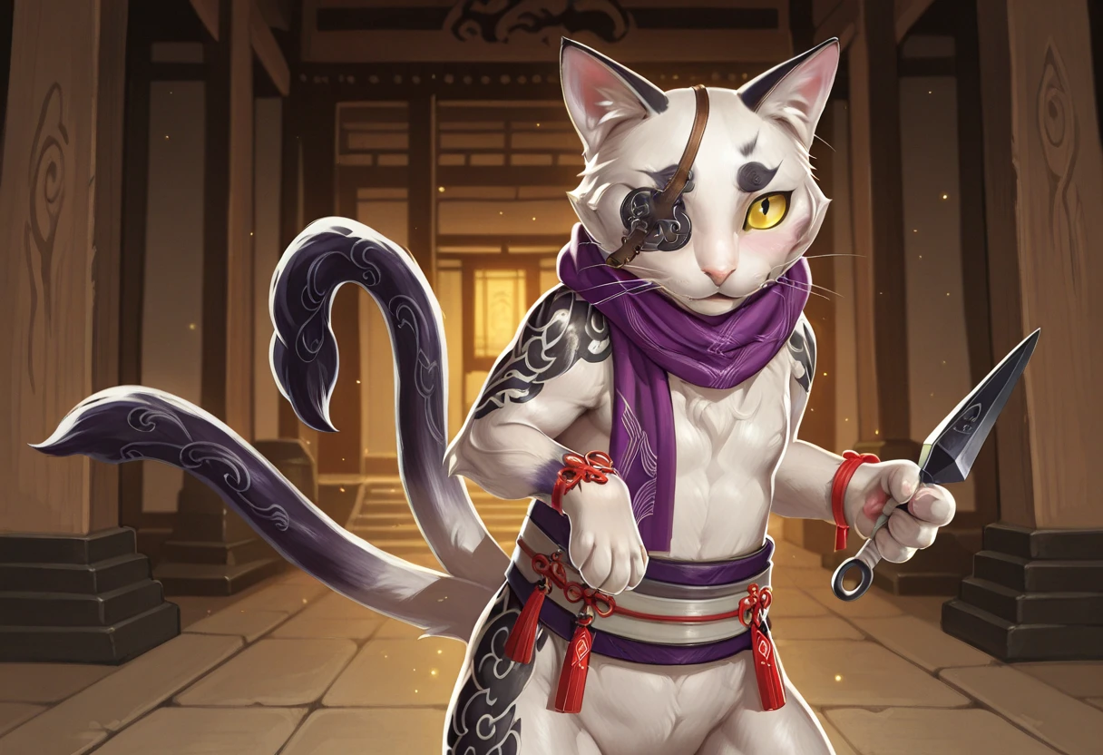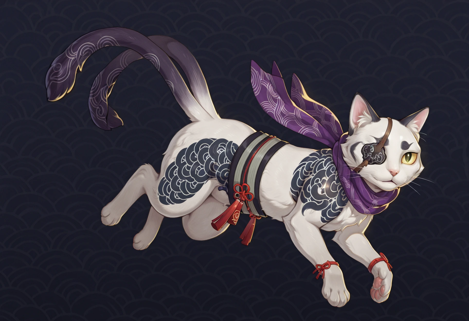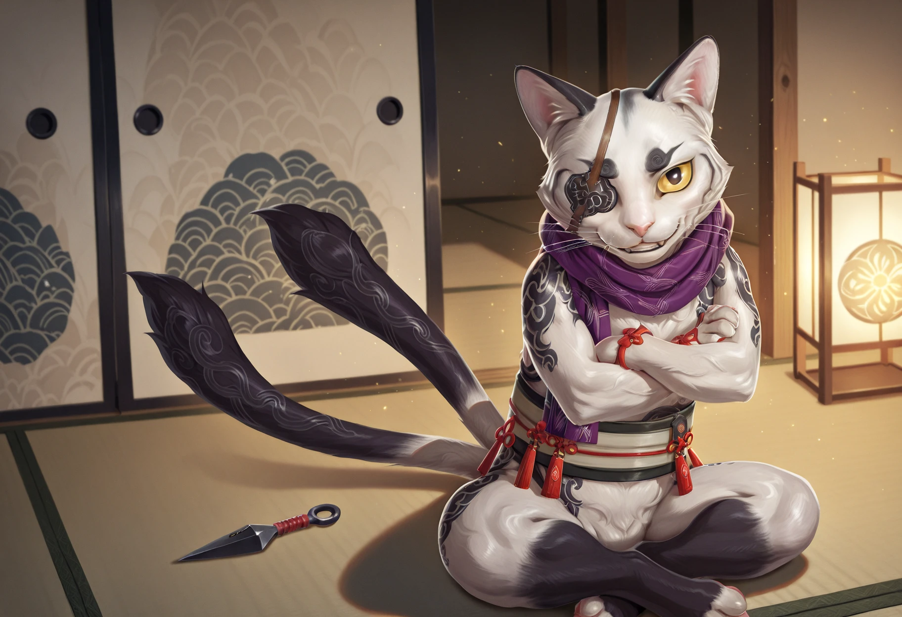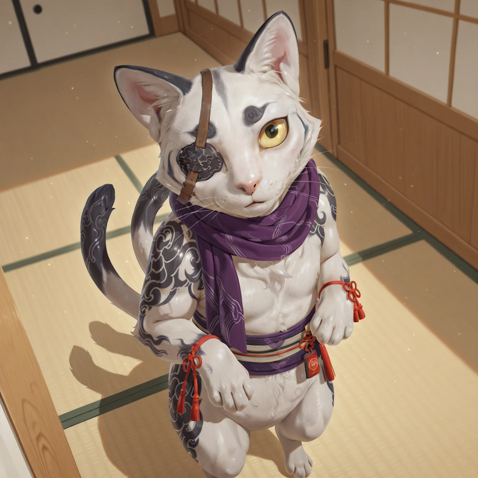 Regular Tags: cat, white fur, purple scarf, whiskers, eyepatch, yellow sclera, black pupil, two tails, semi-anthro, sash, wrist ribbons, tattoo