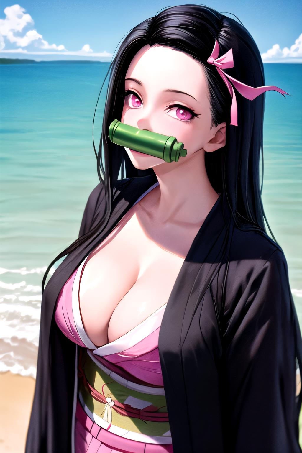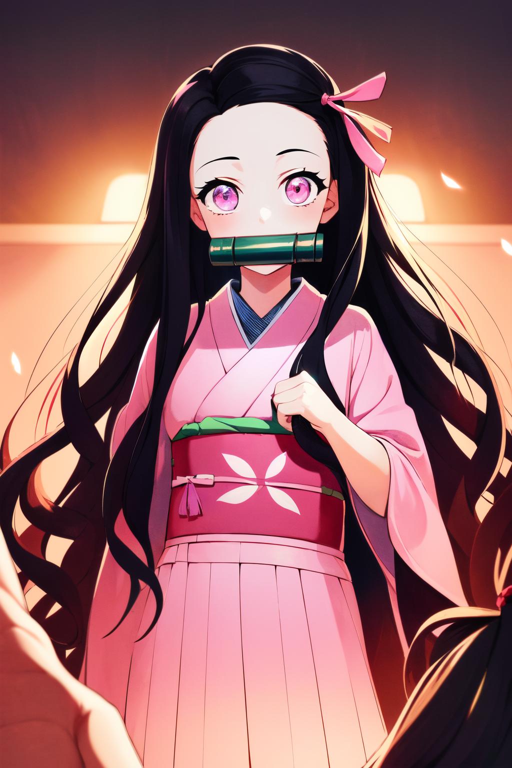 nezuko,1girl,pink eyes,long hair, pink kimono,two-tone hair, ribbon