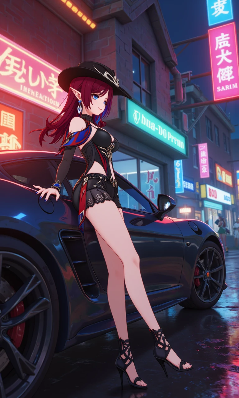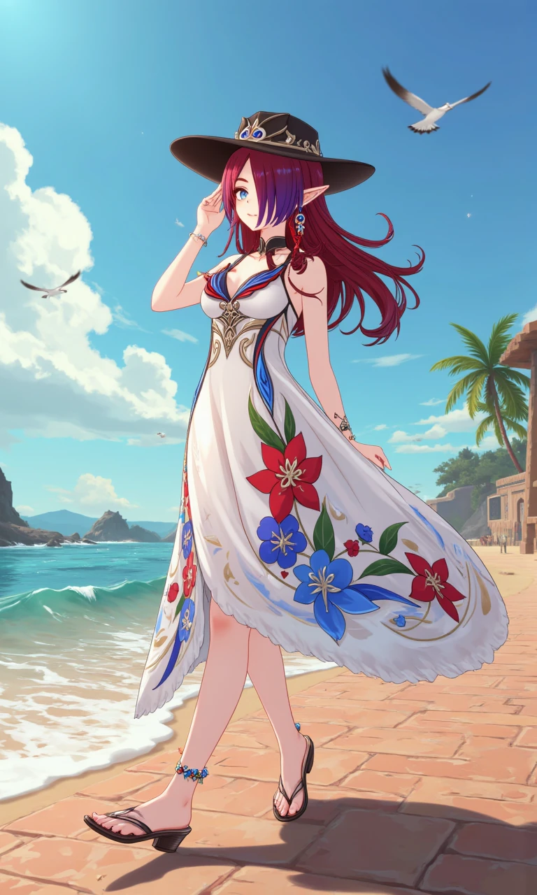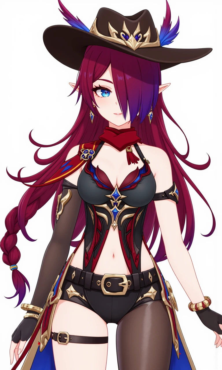 tj_chasca,pointy ears,long hair,multicolored hair,red hair,purple hair,blue eyes,hair over one eye,braid,earrings,jewelry,