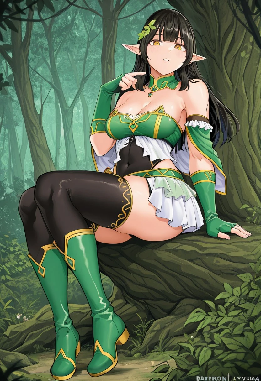 strapless top,green top,white top,detached sleeves,green finger cut gloves,white skirt,ruffled skirt,miniskirt,black thighhighs,green boots,knee-high boots,split skirt,leotard