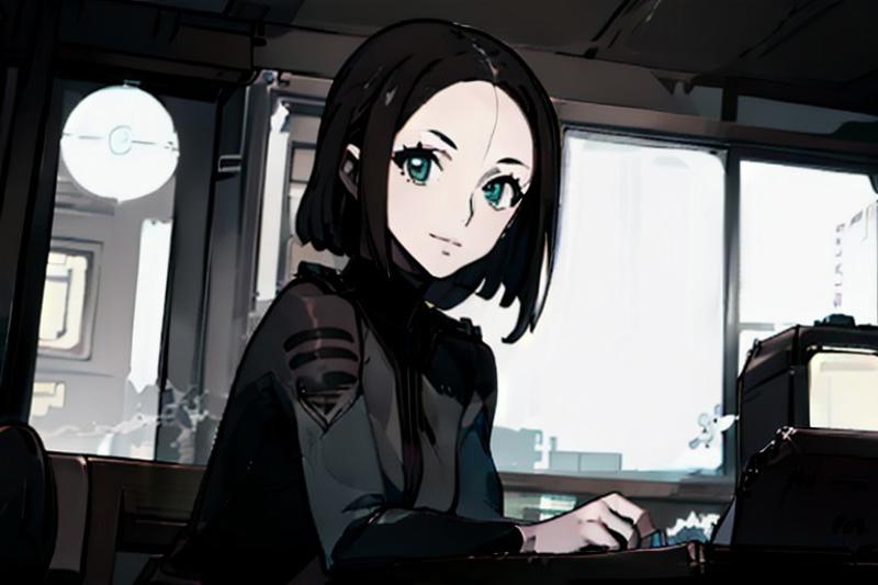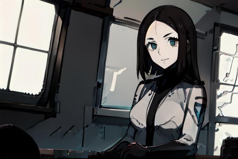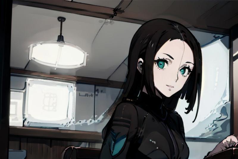 pale skin,parted bangs,(forehead:0.6),black hair,long hair,aqua eyes,