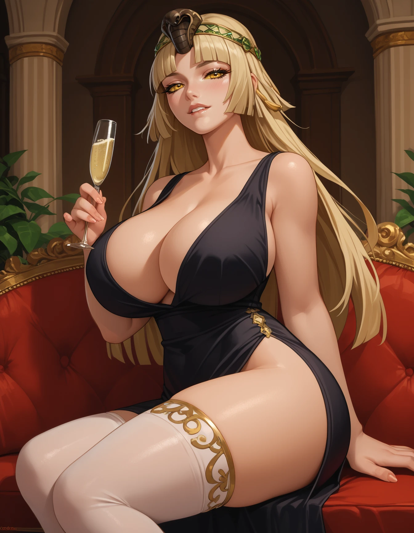 "cleosmt, long hair, uraeus, yellow sclera, yellow eyes, blunt bangs, blonde hair, colored sclera"