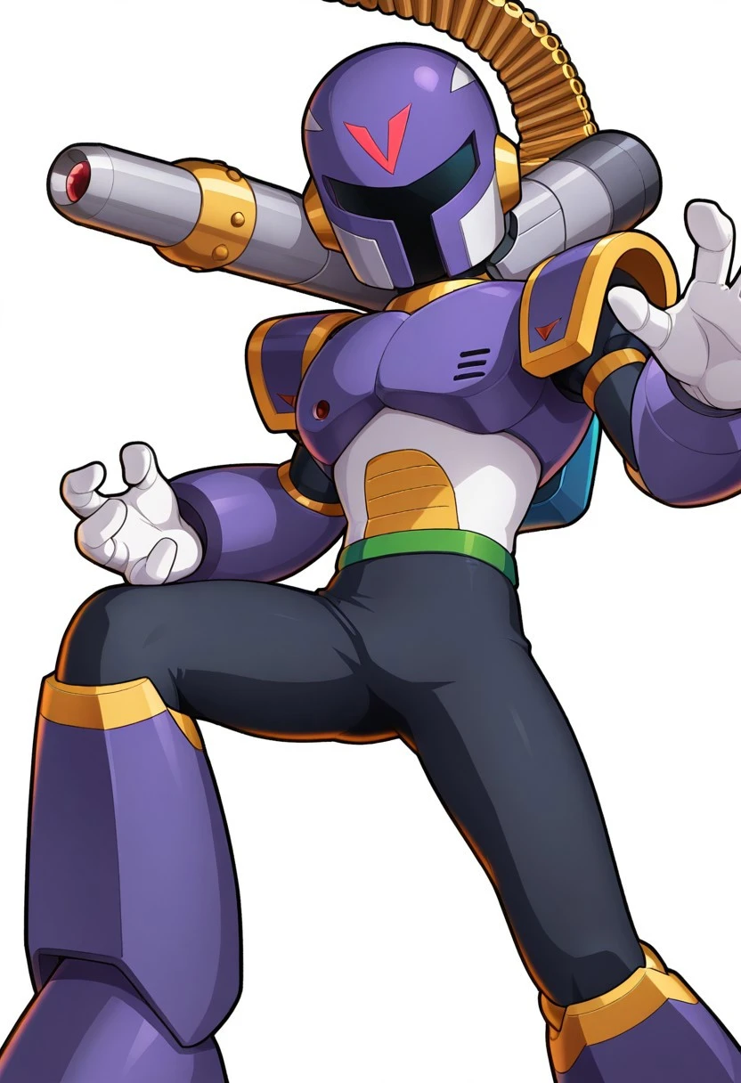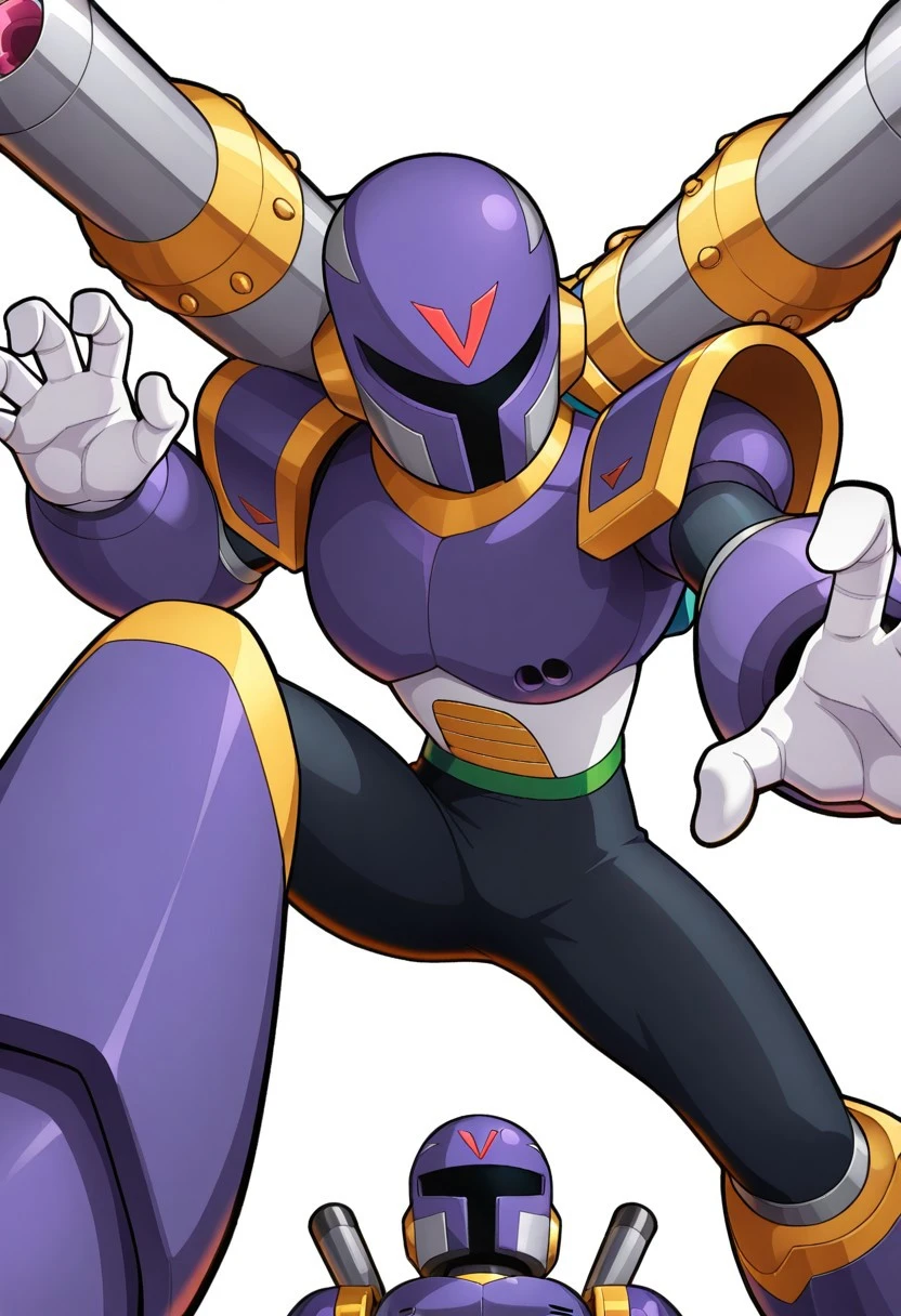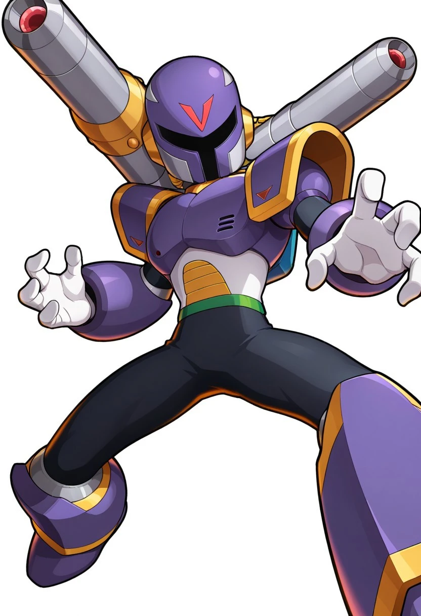 VileX, 1 boy, Purple helmet, faceless, Cannon on the shoulder, Purple armor, white gloves, Android, Purple boots, black bodysuit,