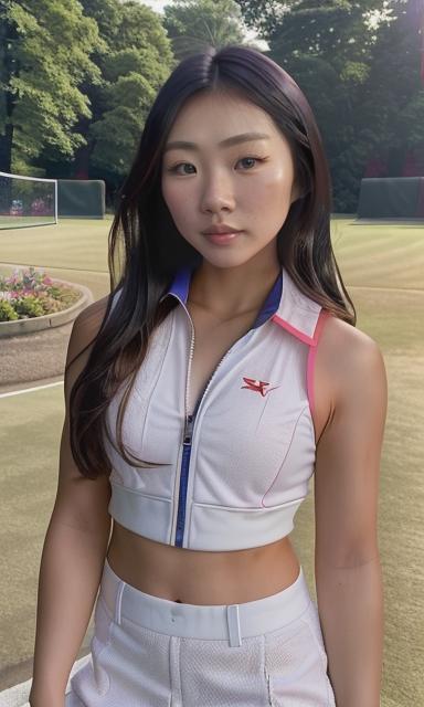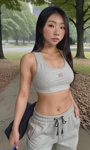 a captivating pov photo of insta model <lora:sandy:1> sandy, 22 years old, hmong, fit, slim, petite, wearing a sports bra and sweat pants, on an early morning jog in the park. amazingly capturing her essence and beauty. ((photo realistic)) (hdr) (detailed faces)Description
