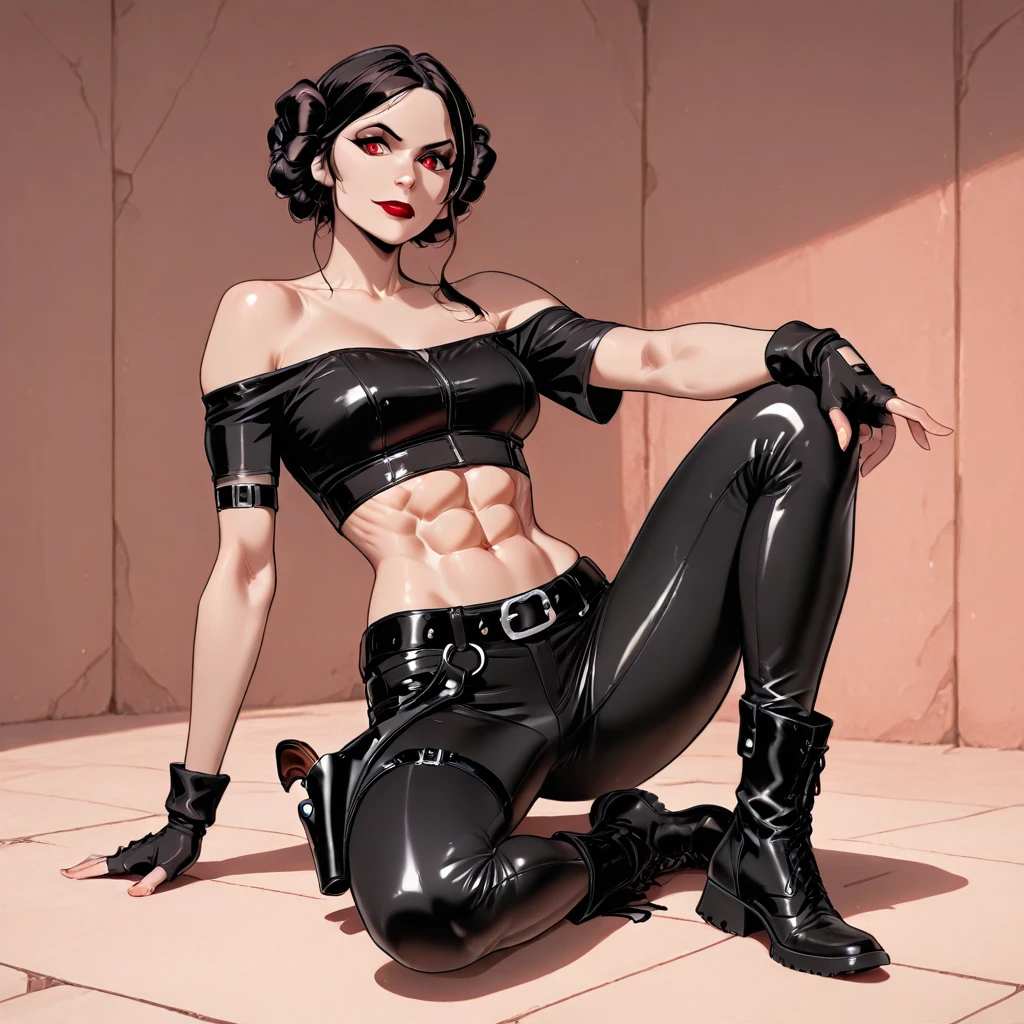 low-rise leather pants, black belt, black buckle, holster, black boots,