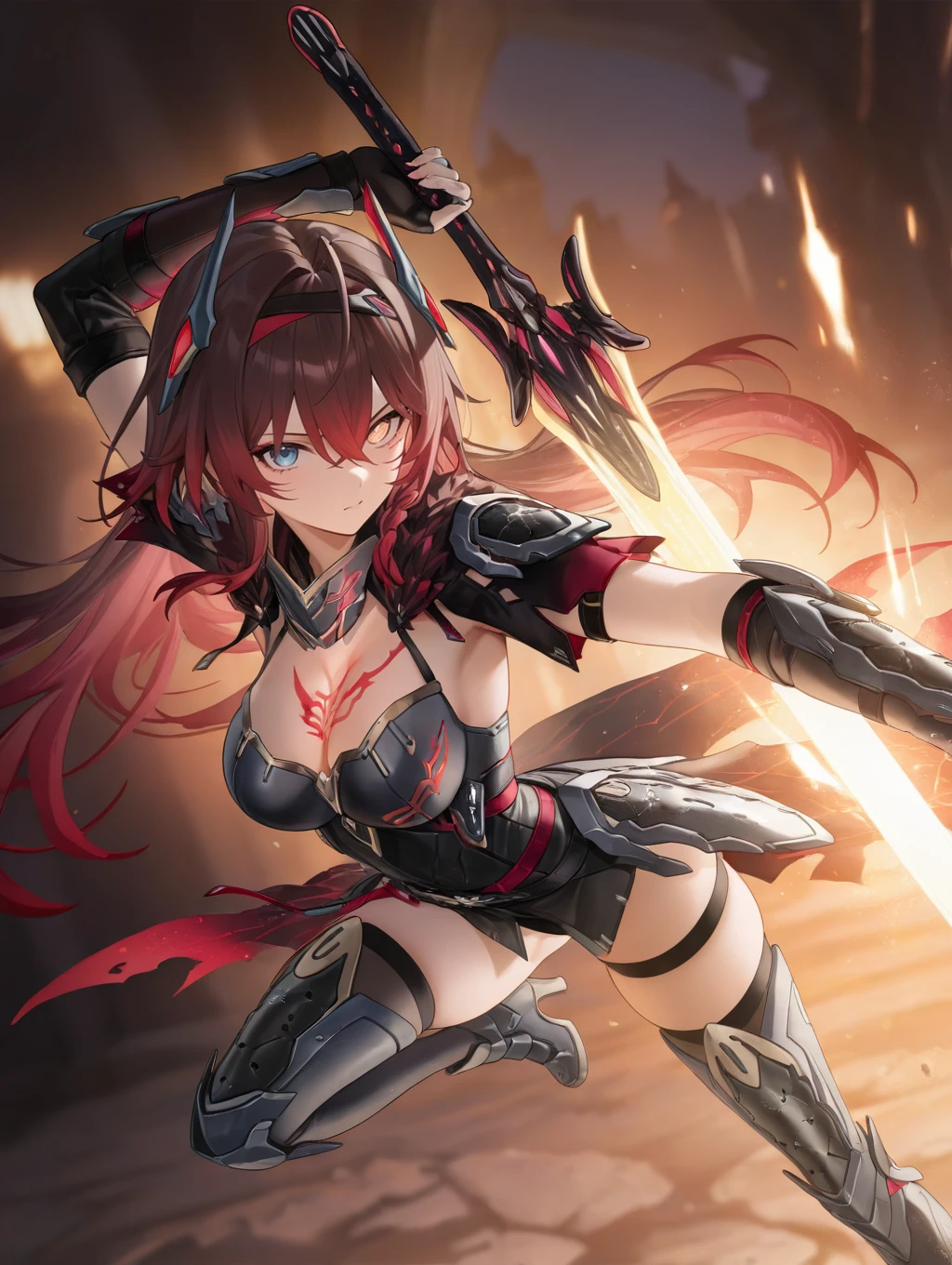 ay-verthandi,long hair,yellow eyes,blue eyes,red hair,multicolored hair,heterochromia,medium breasts,facial tattoo,hair between eyes,chest tattoo,brown hair,gradient hair,gloves,hair ornament,armor,boots,thigh strap,armored boots,cleavage,thighhighs,black dress,fingerless gloves,black gloves,dress,gauntlets,high heels,holding sword,weapon,holding,sword,