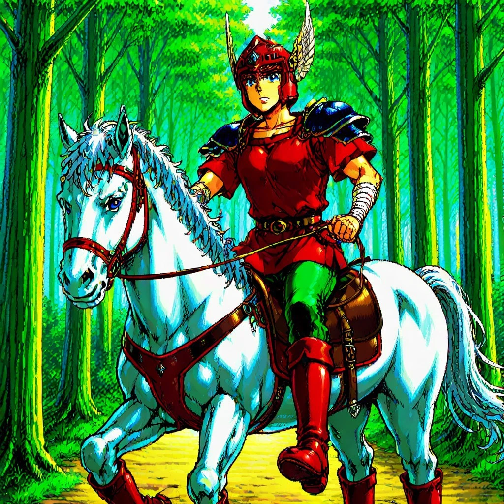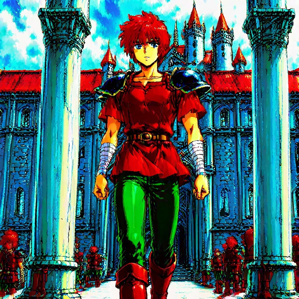 Extra: pauldrons, red cuirass, red tunic, short sleeves, green pants, red boots, arm bandages, belt
