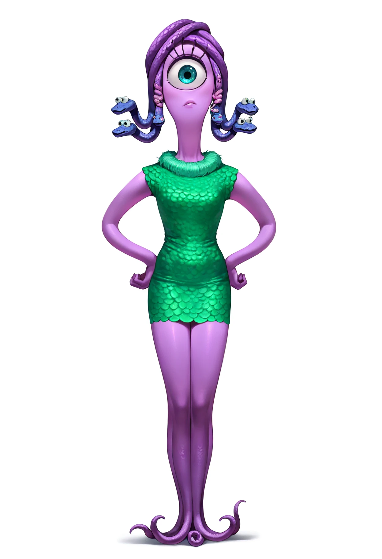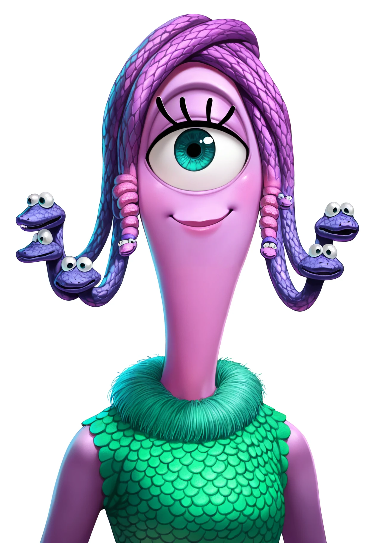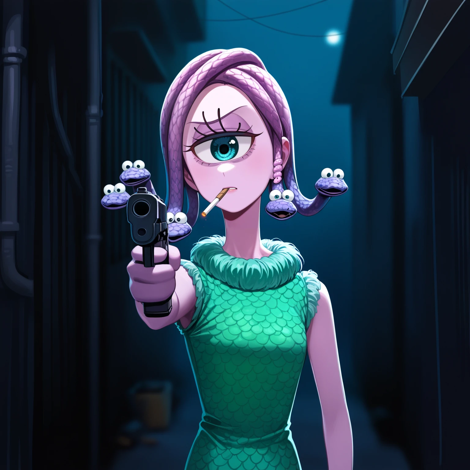 Basic prompts : 1girl, celiamae, one-eyed, purple hair, aqua eyes, snake hair, monster girl, cyclops, purple skin, tentacle legs, no fingers