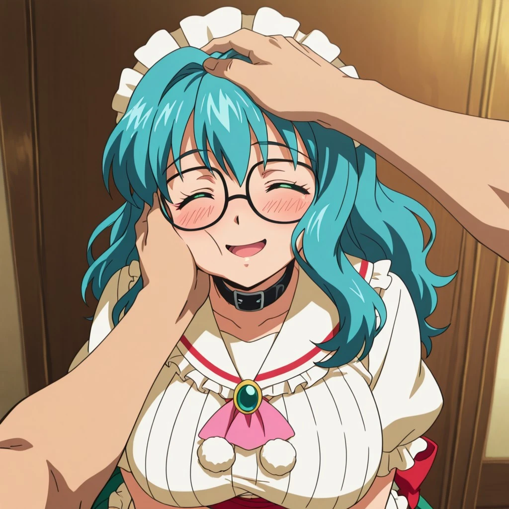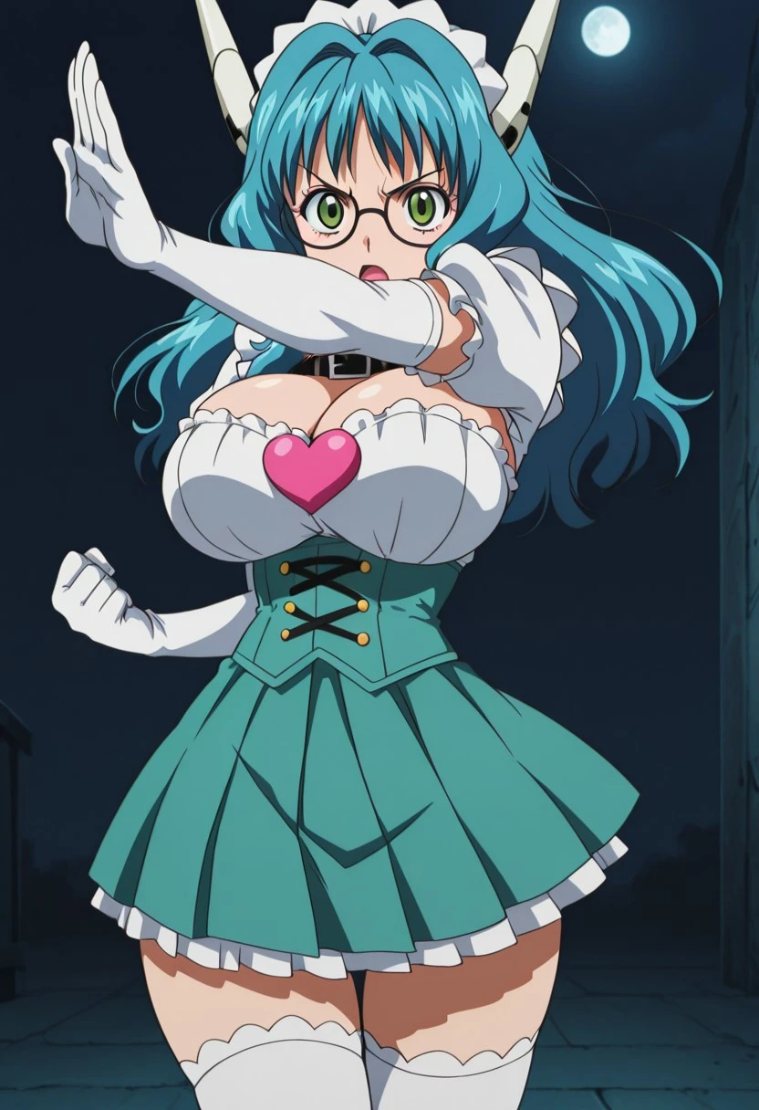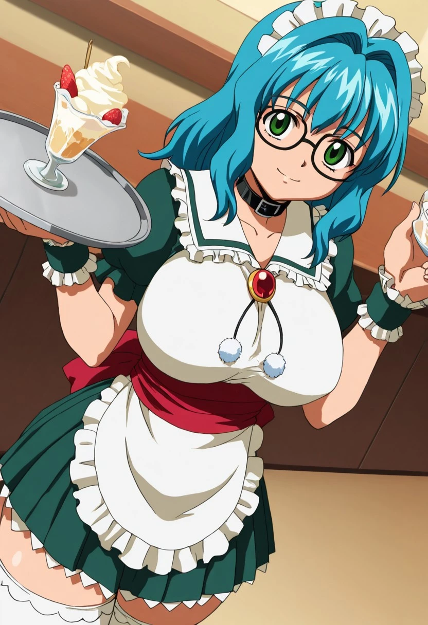 Trigger: Harue, long hair, cyan blue hair, green eyes, Square and thick black glasses, huge breasts, curves, wide hips,