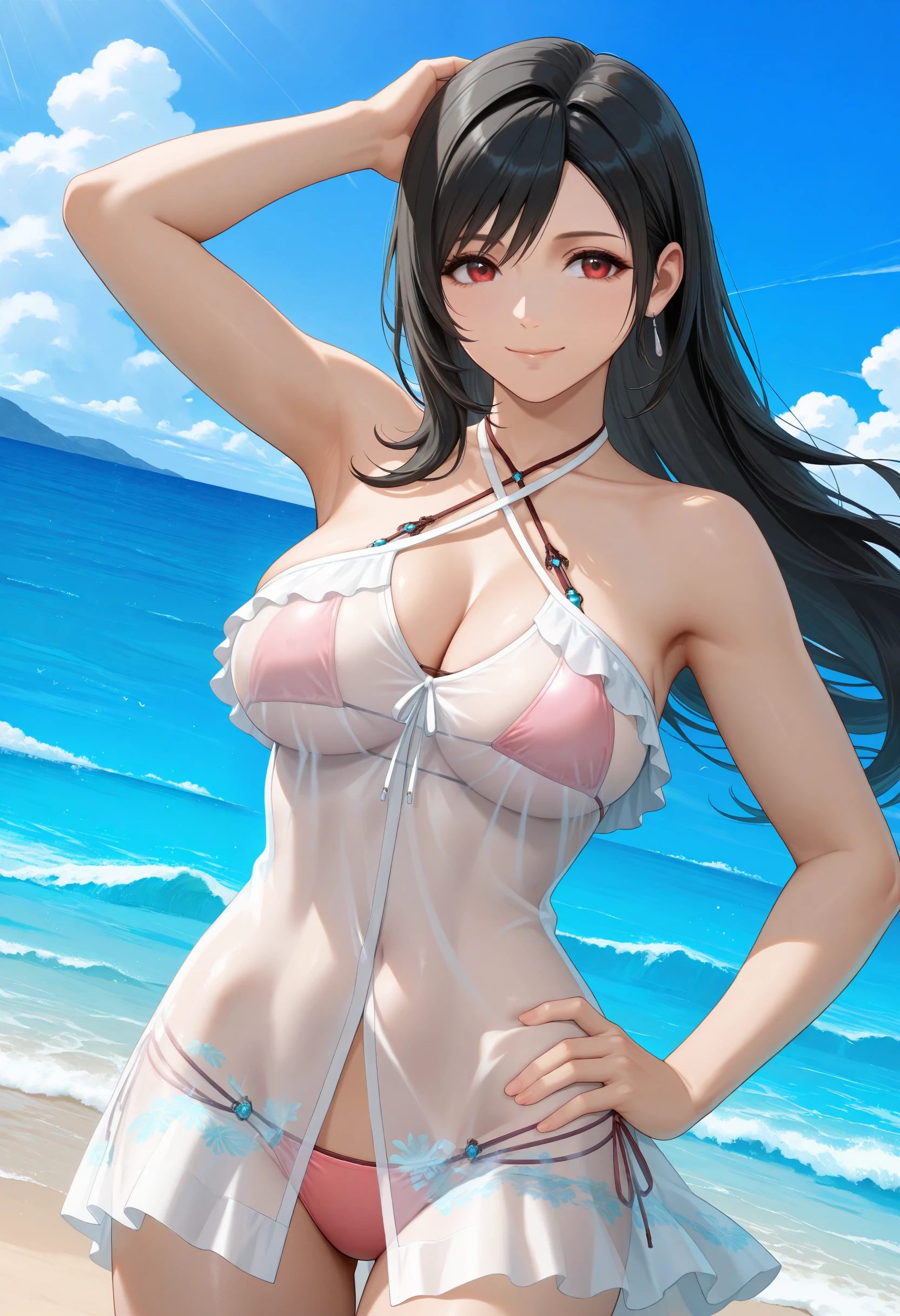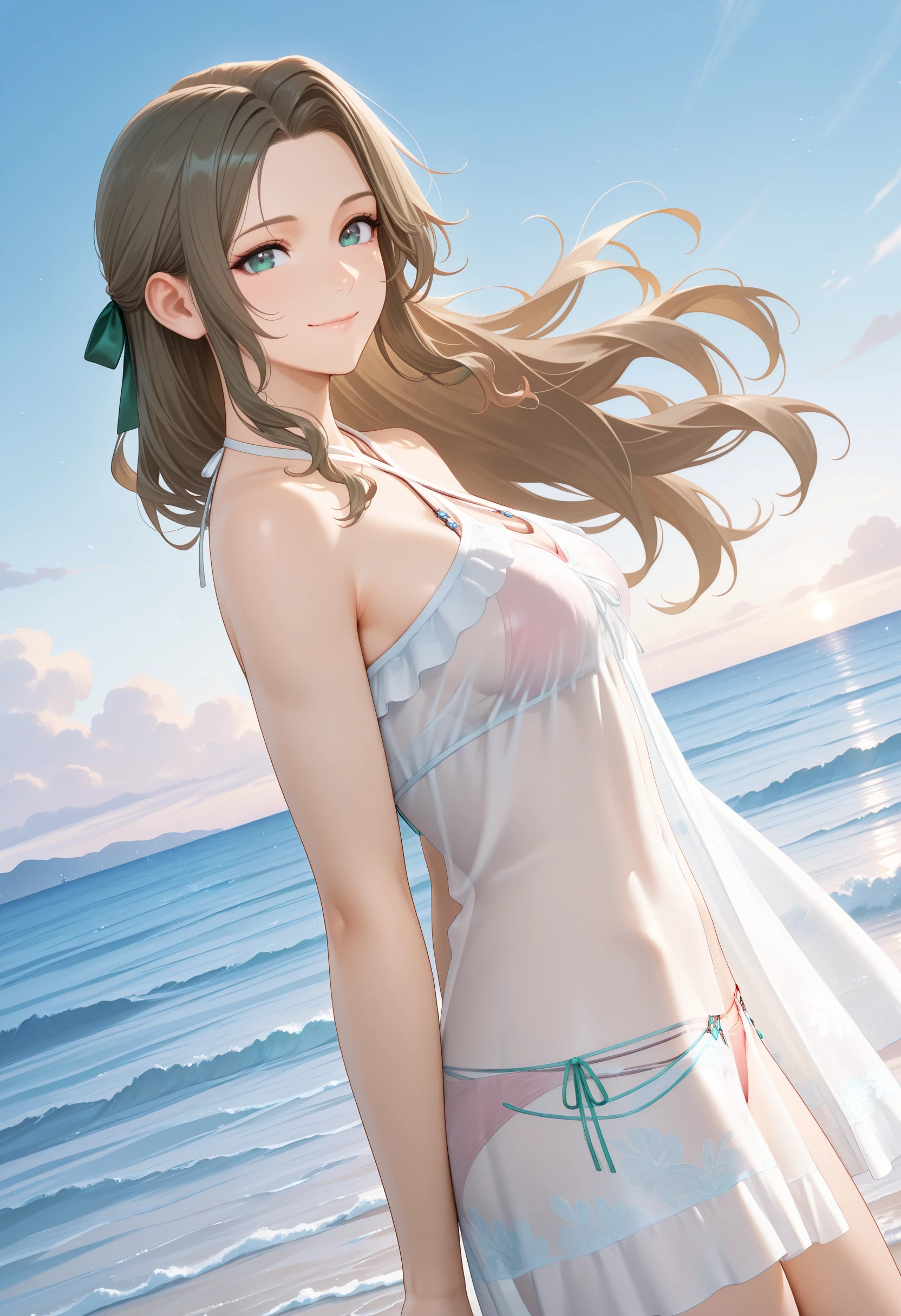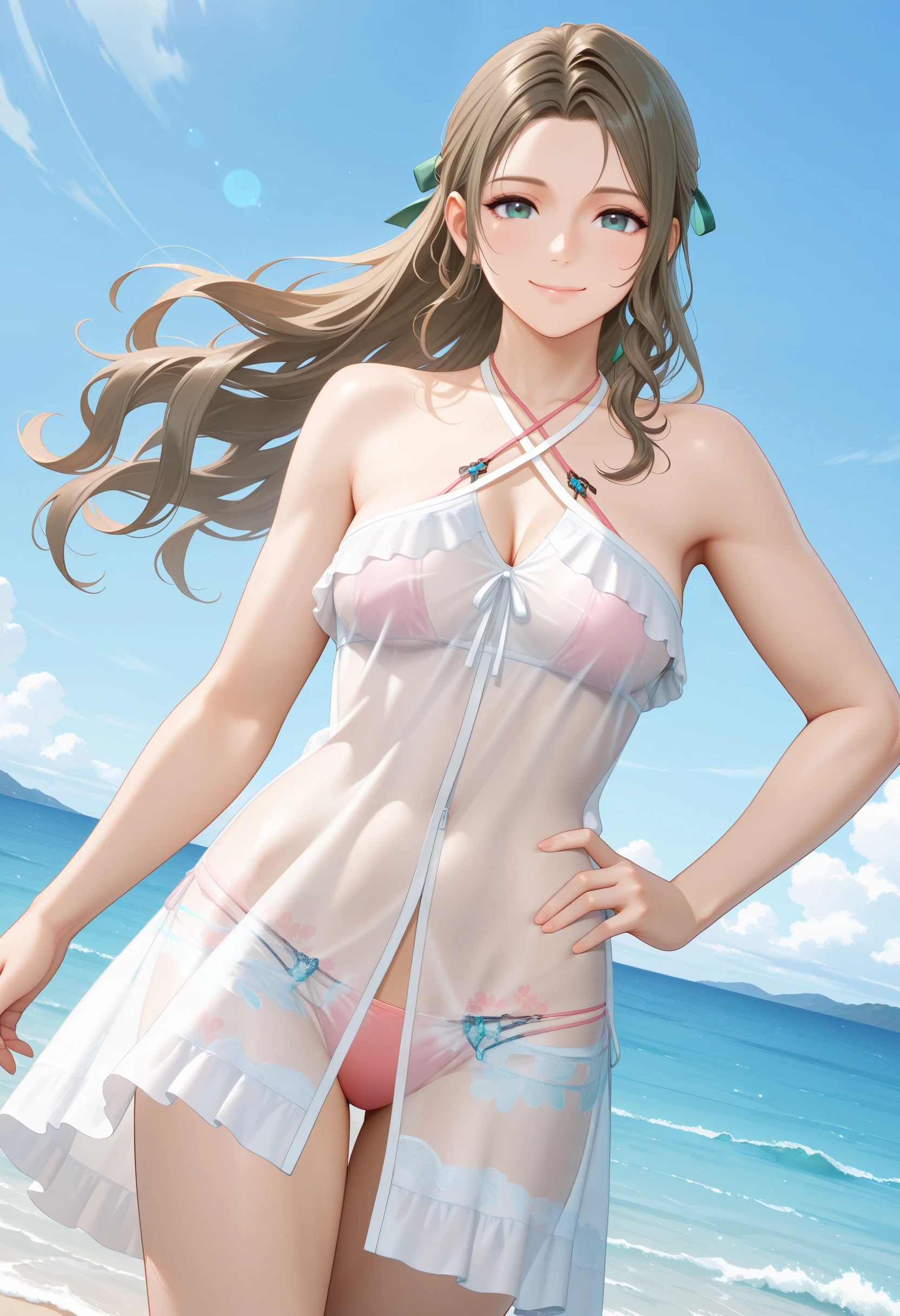 MistyLilyDoaxvv,criss-cross halter,bikini under clothes,white dress,see-through,pink bikini,jewelry,strappy heels,toeless footwear