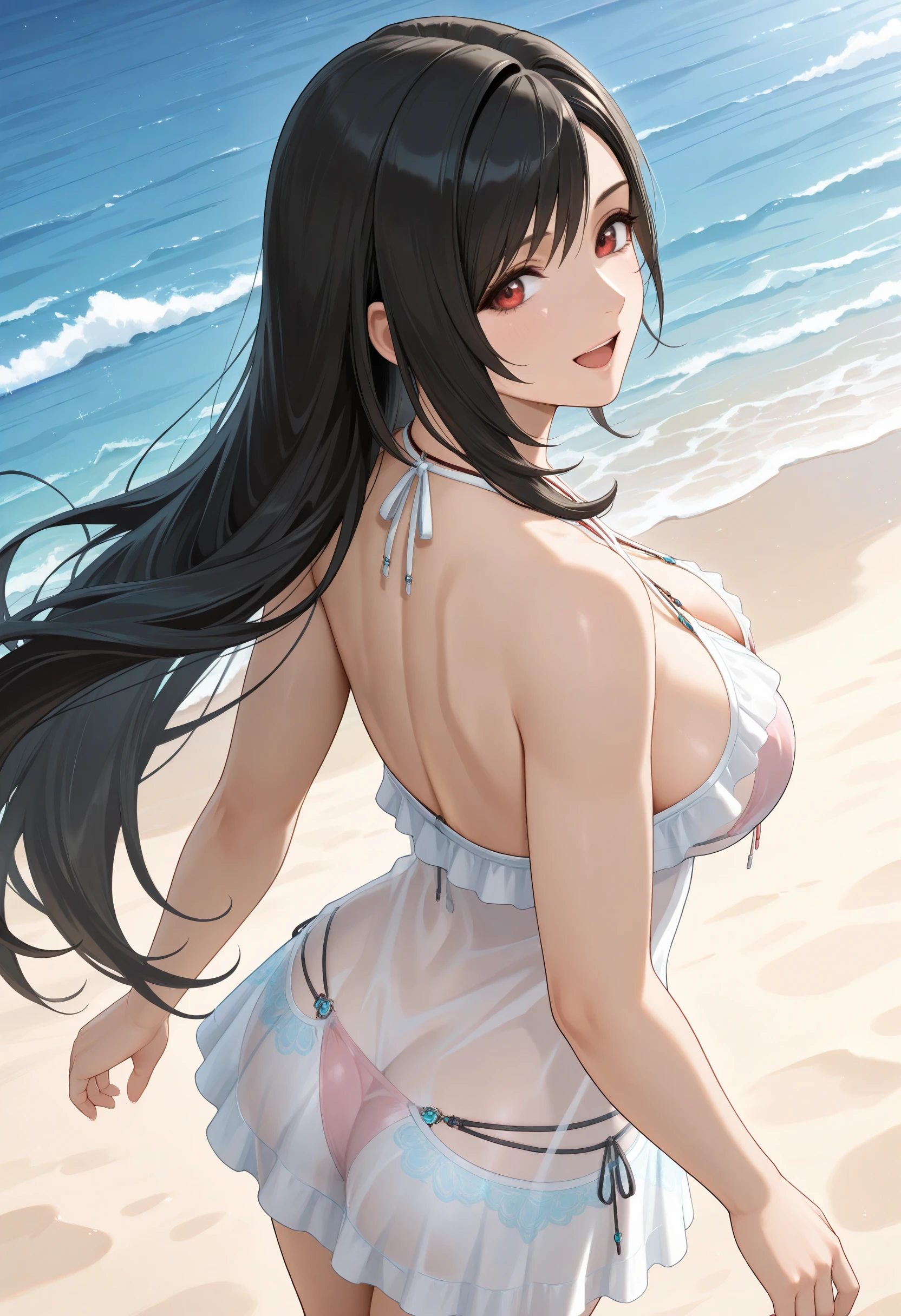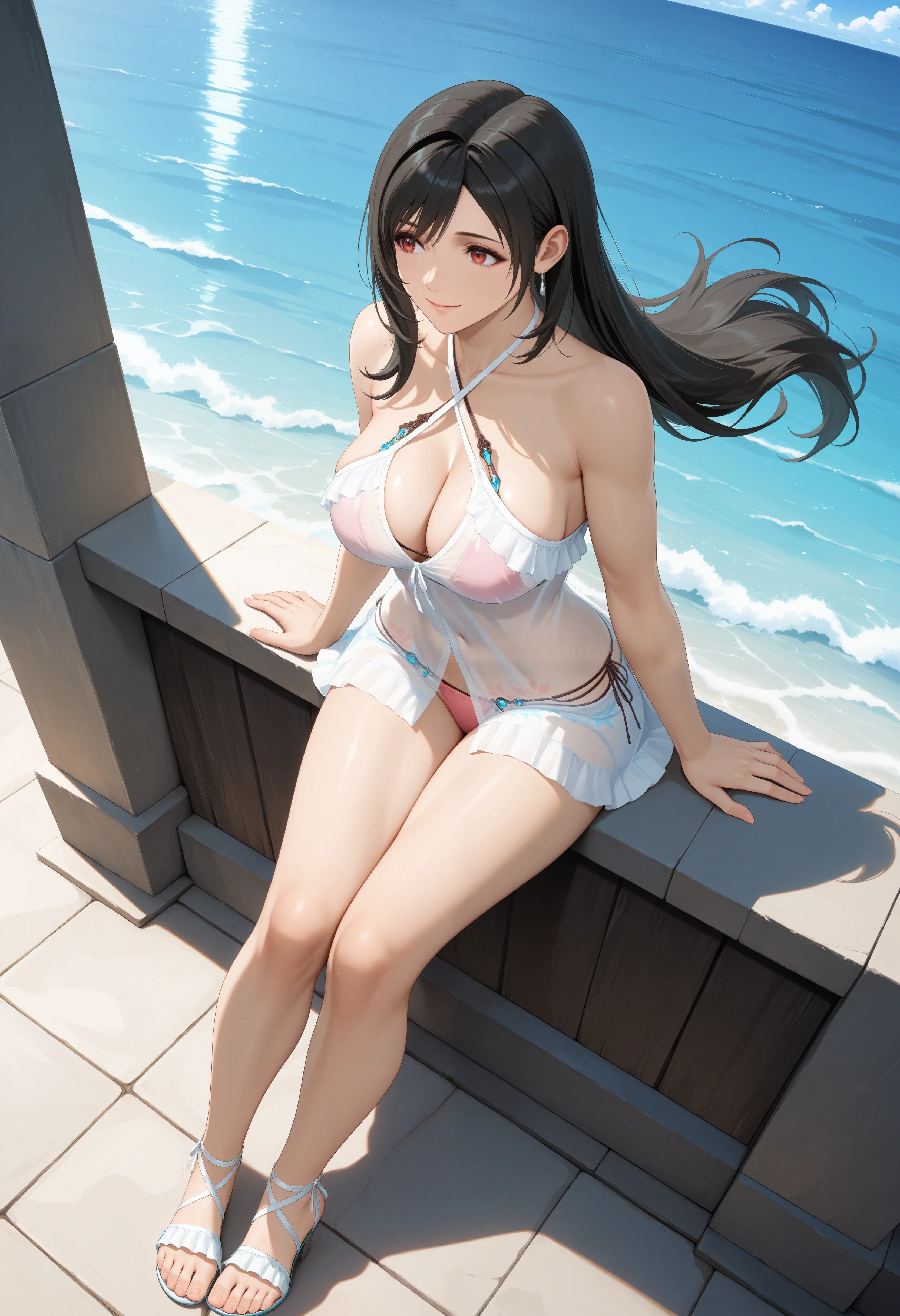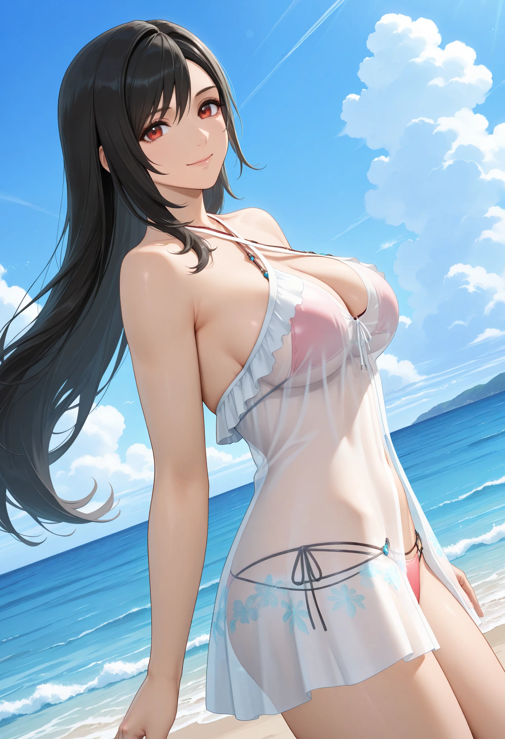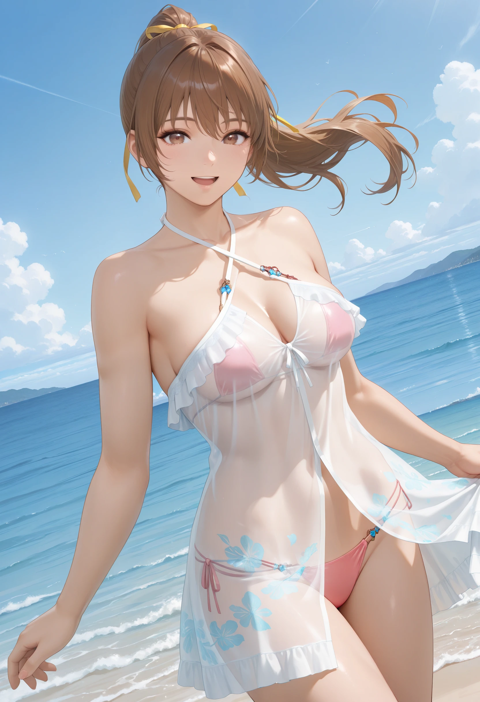 MistyLilyDoaxvv,criss-cross halter,bikini under clothes,white dress,see-through,pink bikini,jewelry,strappy heels,toeless footwear