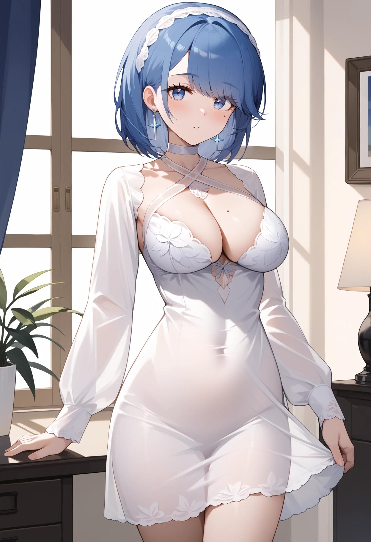 outfit3aachapa, short hair, blue hair, white hairband, earrings, blue eyes, mole on breast, white choker, nightgown, cleavage, lace-trimmed dress, see-through dress, white dress, long sleeves