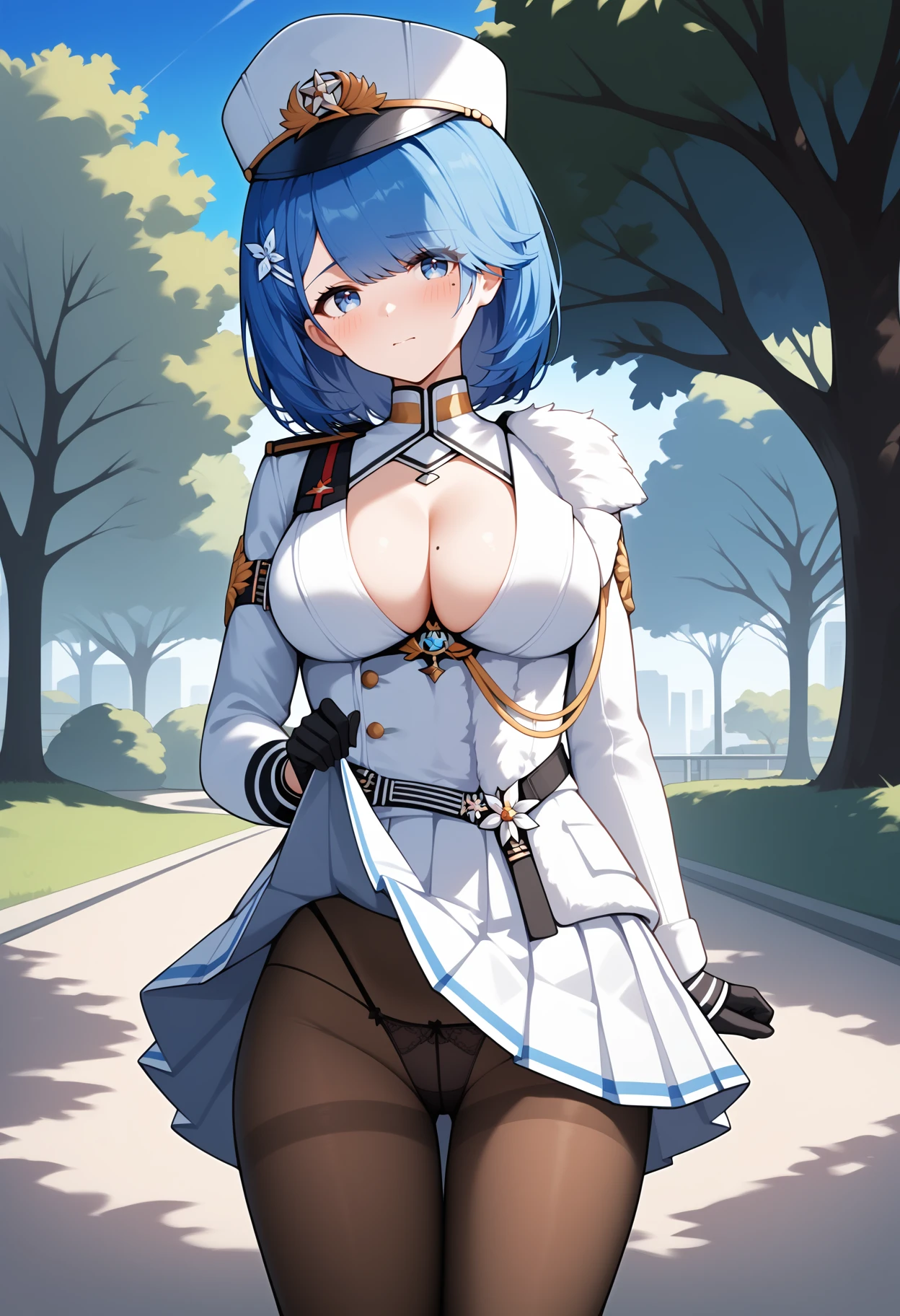 outfit1aachapa, short hair, blue hair, hair ornament, peaked cap, white headwear, blue eyes, mole on breast, breasts, military uniform, cleavage, white jacket, long sleeves, black gloves, pleated skirt, white skirt, black pantyhose