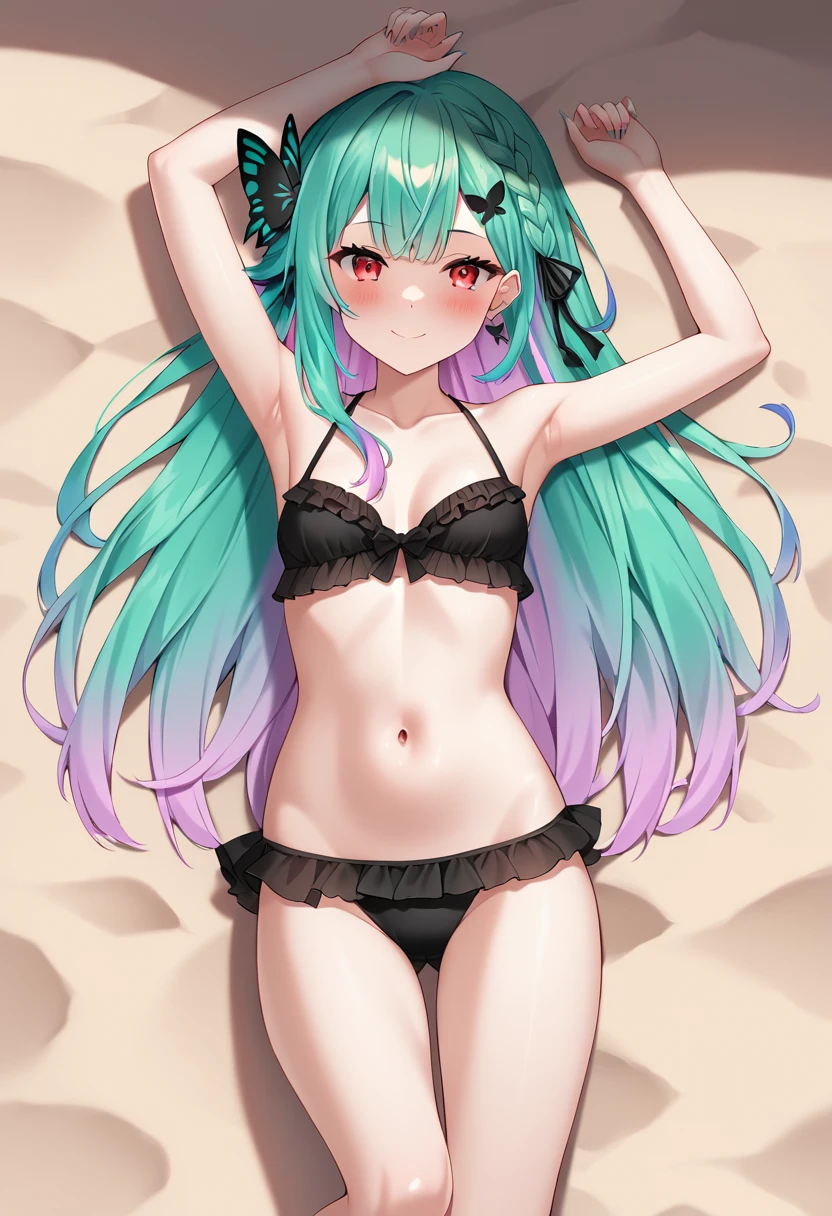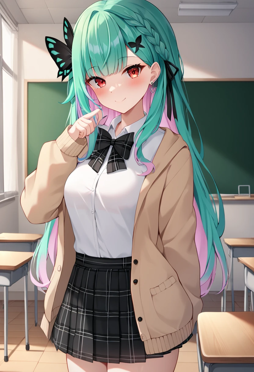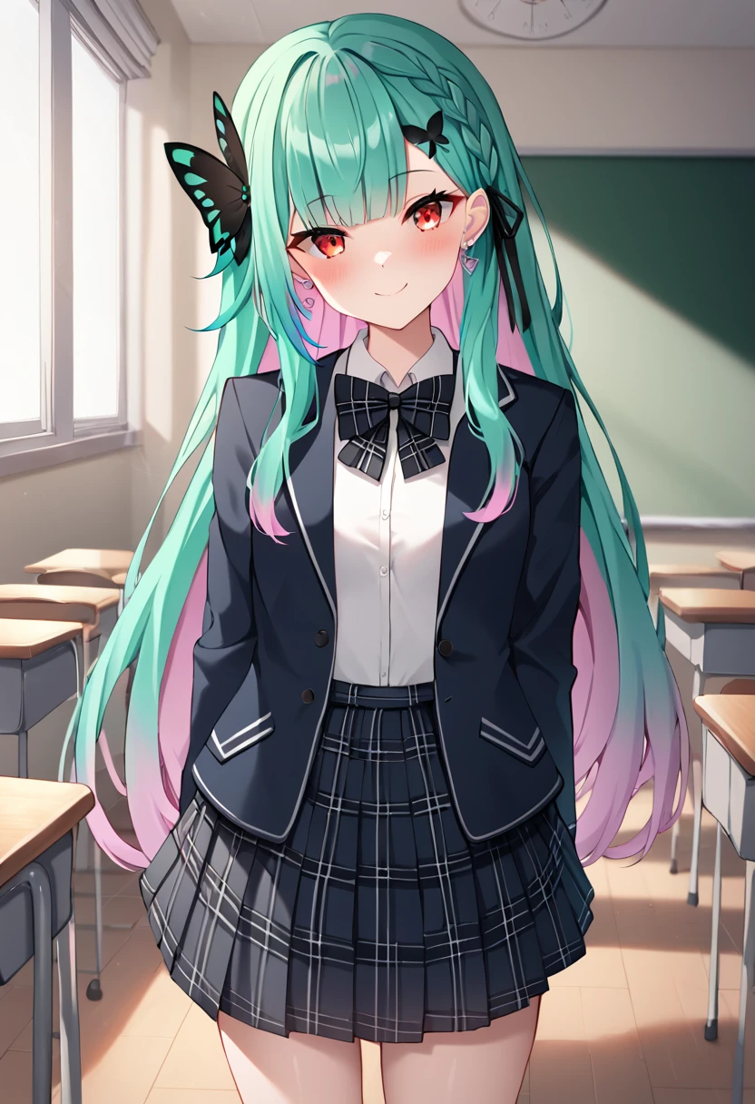 Rushia jk: rushia_jk, multicolored hair, pink hair, green hair, long hair, red eyes, braid, small breasts, butterfly hair ornament, virtual youtuber, hair ornament, petite,