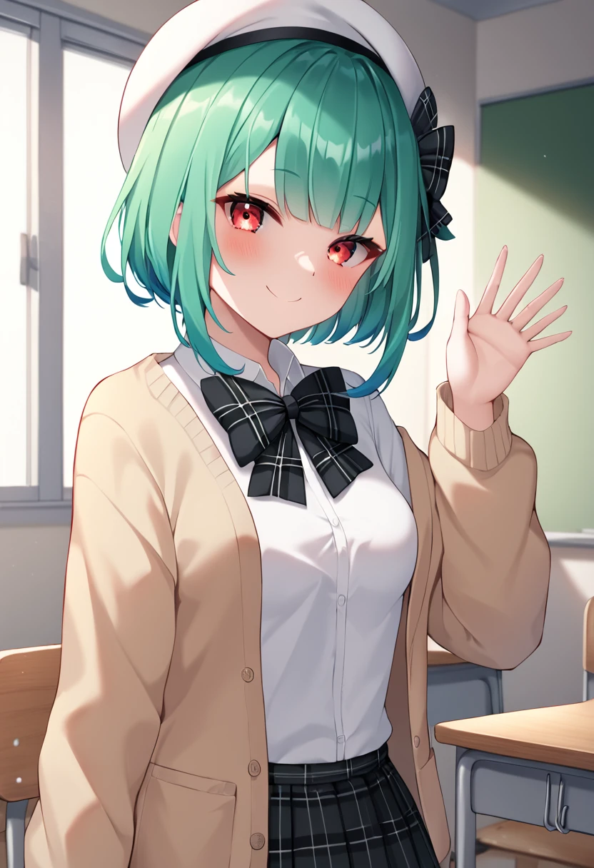Jk outfit: skirt, ribbon, earrings, jewelry, plaid, plaid skirt, beige cardigan, open cardigan, bowtie, collared shirt, Use this to trigger the jacket instead of the cardigan: blue jacket, open jacket