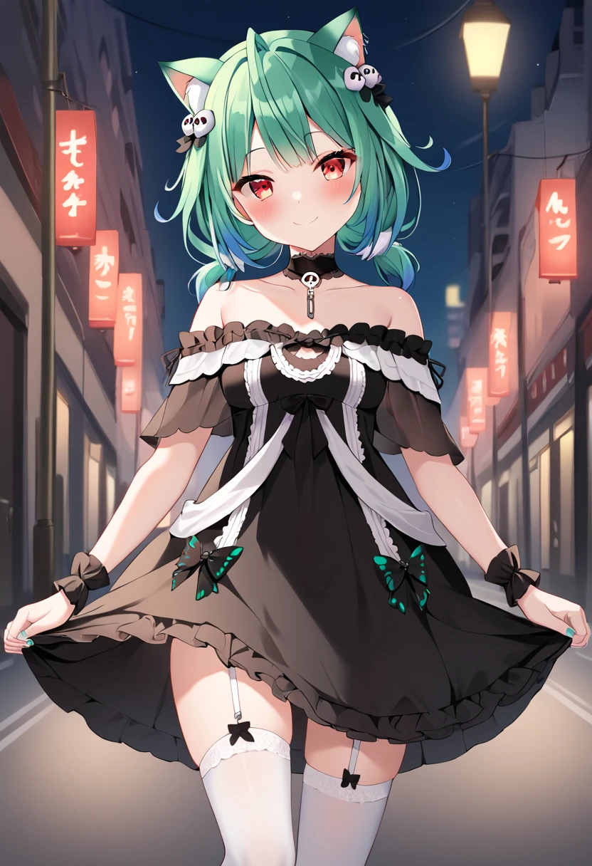 Rushia default: uruha_rushia, rushia_default, green hair, medium hair, double bun, skull hair ornament, red eyes, small breasts, petite, virtual youtuber, hair ornament, hair bun,