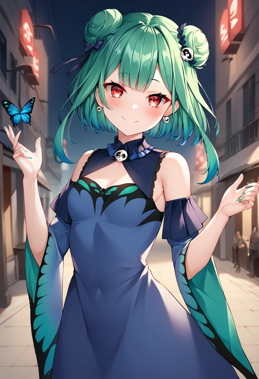 Default outfit outfit: dress, jewelry, earrings, butterfly print, detached sleeves, butterfly dress, blue dress