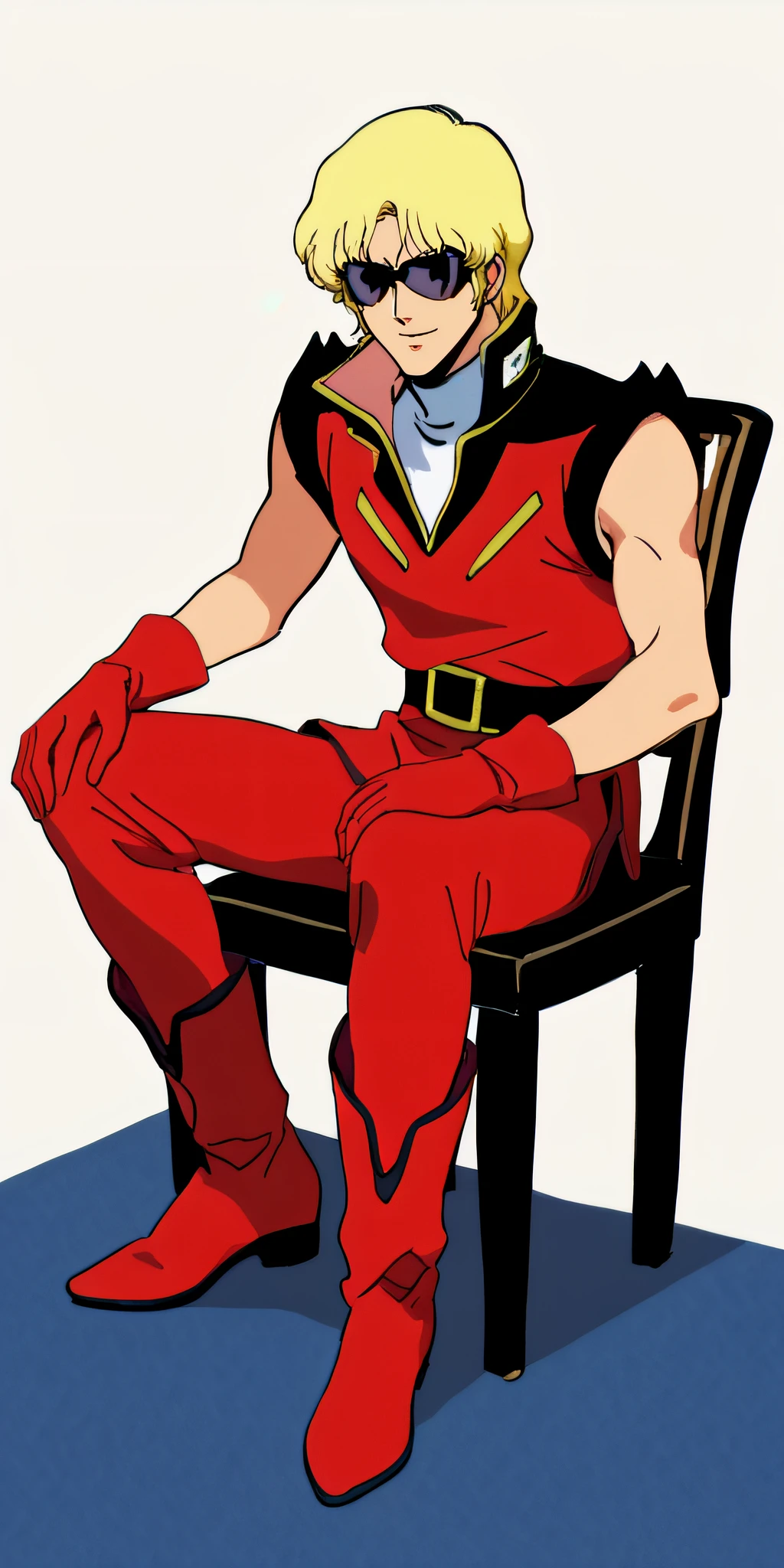 quattro, blonde hair, (opaque sunglasses), red military uniform, bare arms, red gloves, belt, red pants, red boots