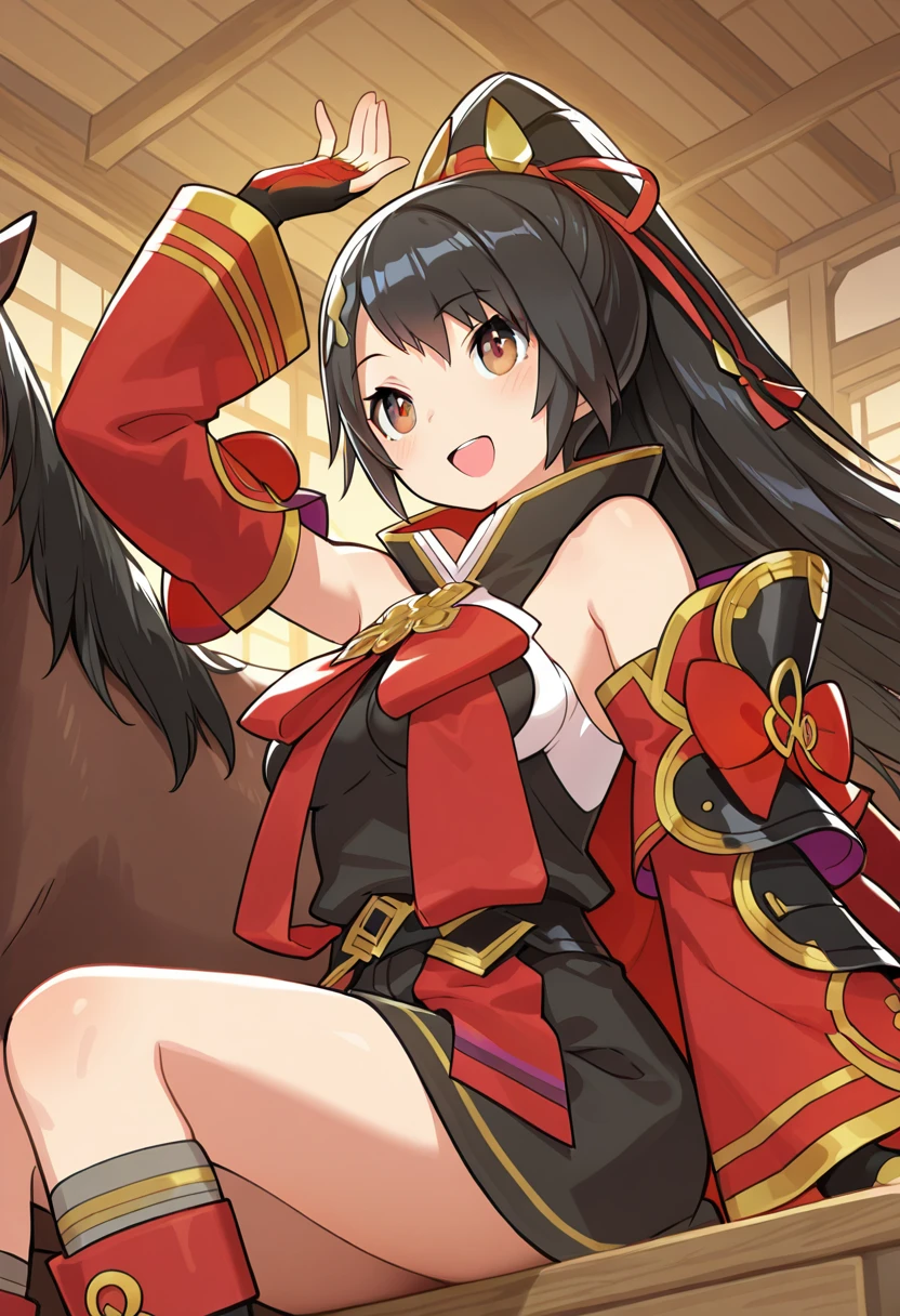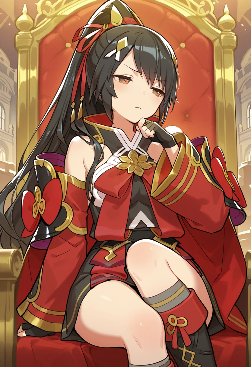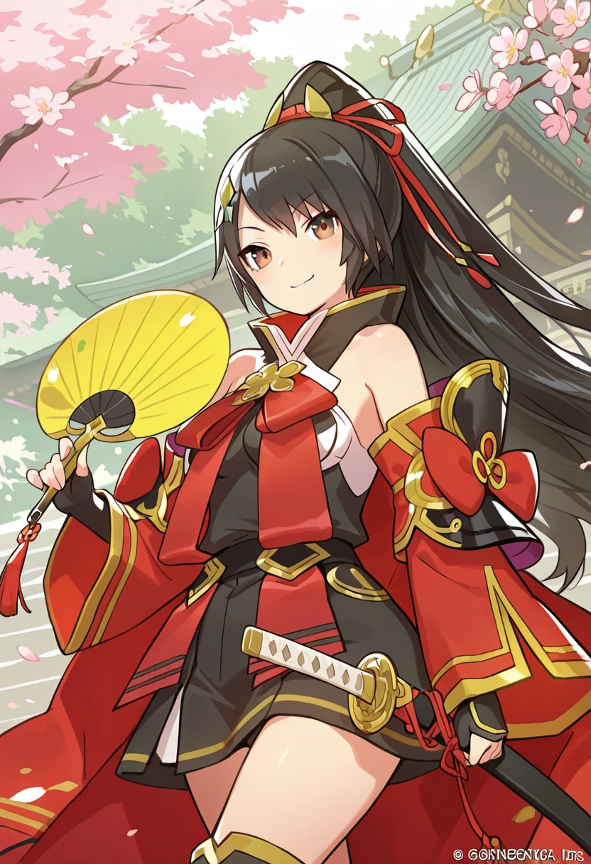 Trigger Words (Outfit): hair ornament, red tie, japanese clothes, black kimono, high collar, short kimono, red bow, gold brooch, detached sleeves, red sleeves, long sleeves, wide sleeves, black arm guards, two-tone gloves, fingerless gloves, black belt, grey socks, knee socks, black boots, knee boots, red boot cuffs,