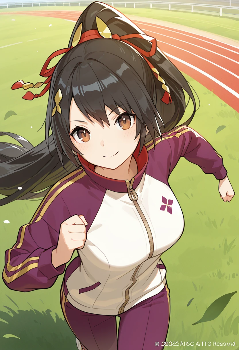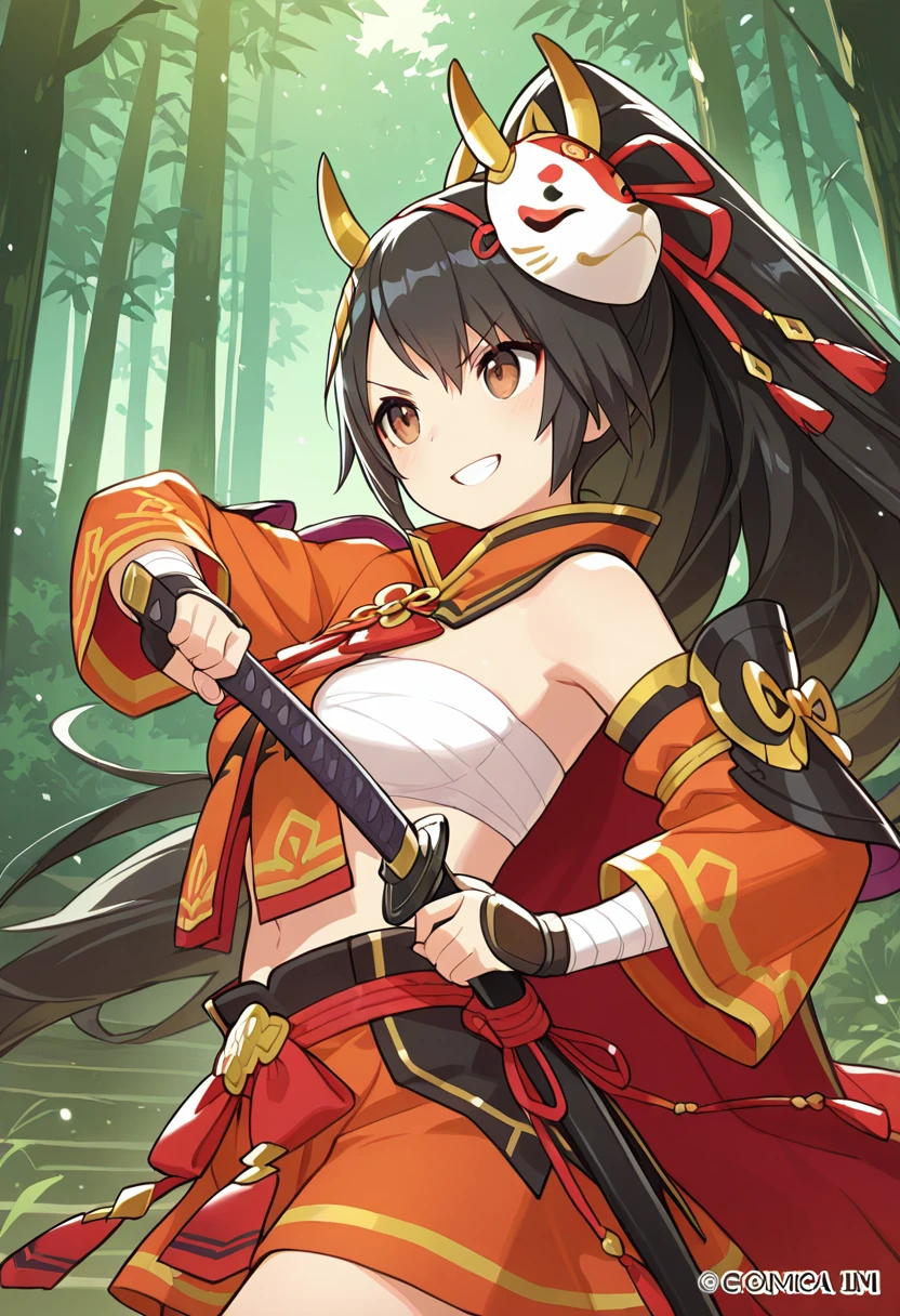 NobunagaDL, black hair, long hair, high ponytail, hair tie, bangs, brown eyes,