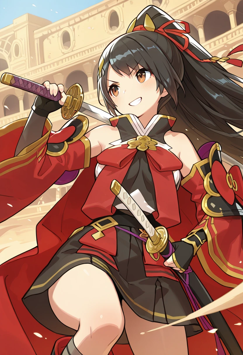 hair ornament, red tie, japanese clothes, black kimono, high collar, short kimono, red bow, gold brooch, detached sleeves, red sleeves, long sleeves, wide sleeves, black arm guards, two-tone gloves, fingerless gloves, black belt, grey socks, knee socks, black boots, knee boots, red boot cuffs,