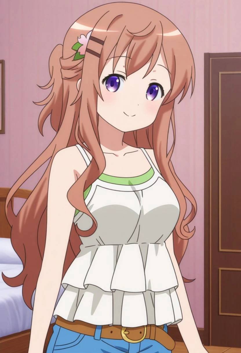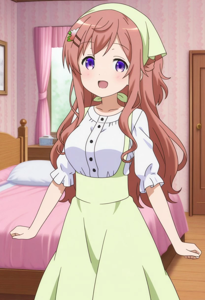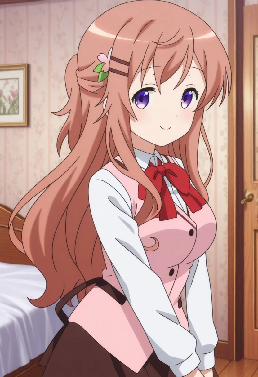 hoto mocha gochiusa anime style, parallel hairclips, hair flower, pink flower, half updo, long hair, brown hair, purple eyes, medium breasts,