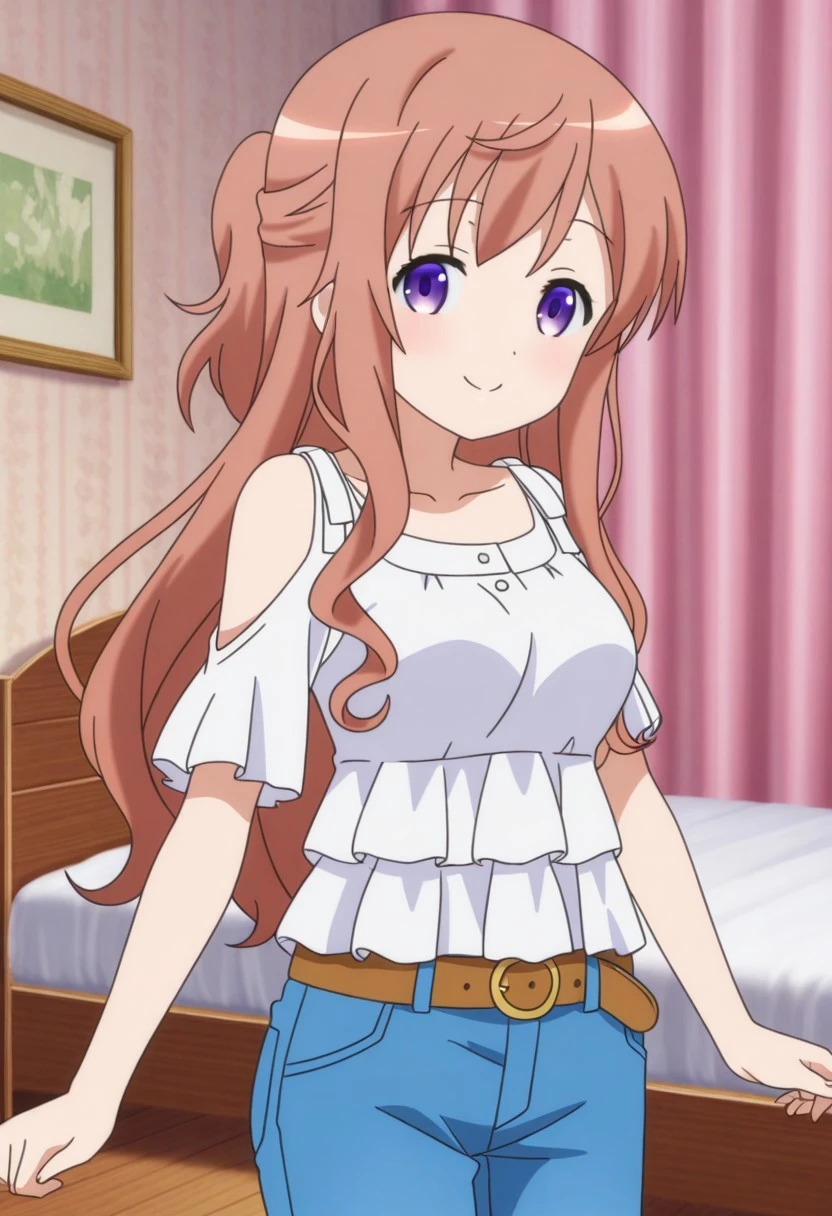 hoto mocha gochiusa movie1 my dear sister casual outfit2, shoulder cutout, layered shirt, frilled shirt, white shirt, frilled sleeves, short sleeves, brown belt, jeans,