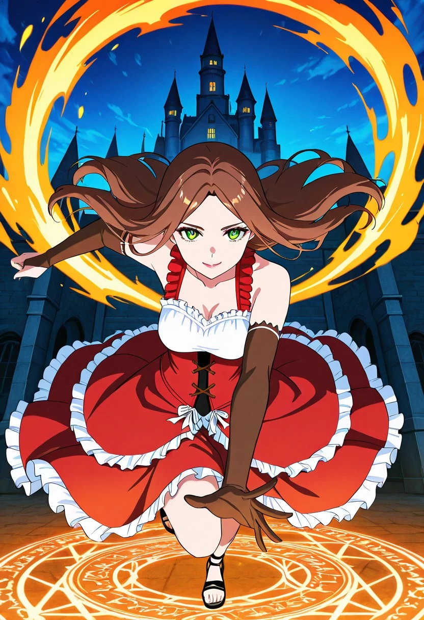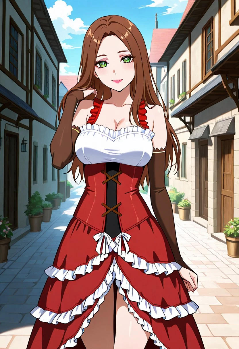 1girl, solo, RachelTN, brown hair, parted bangs, long hair, green eyes, pink lips, large breasts, dress, bare shoulders, red straps, red corset, brown elbow gloves, frilled dress, white ribbon in skirt, long skirt, parted skirt, black sandals