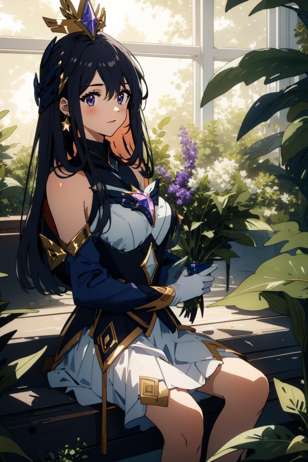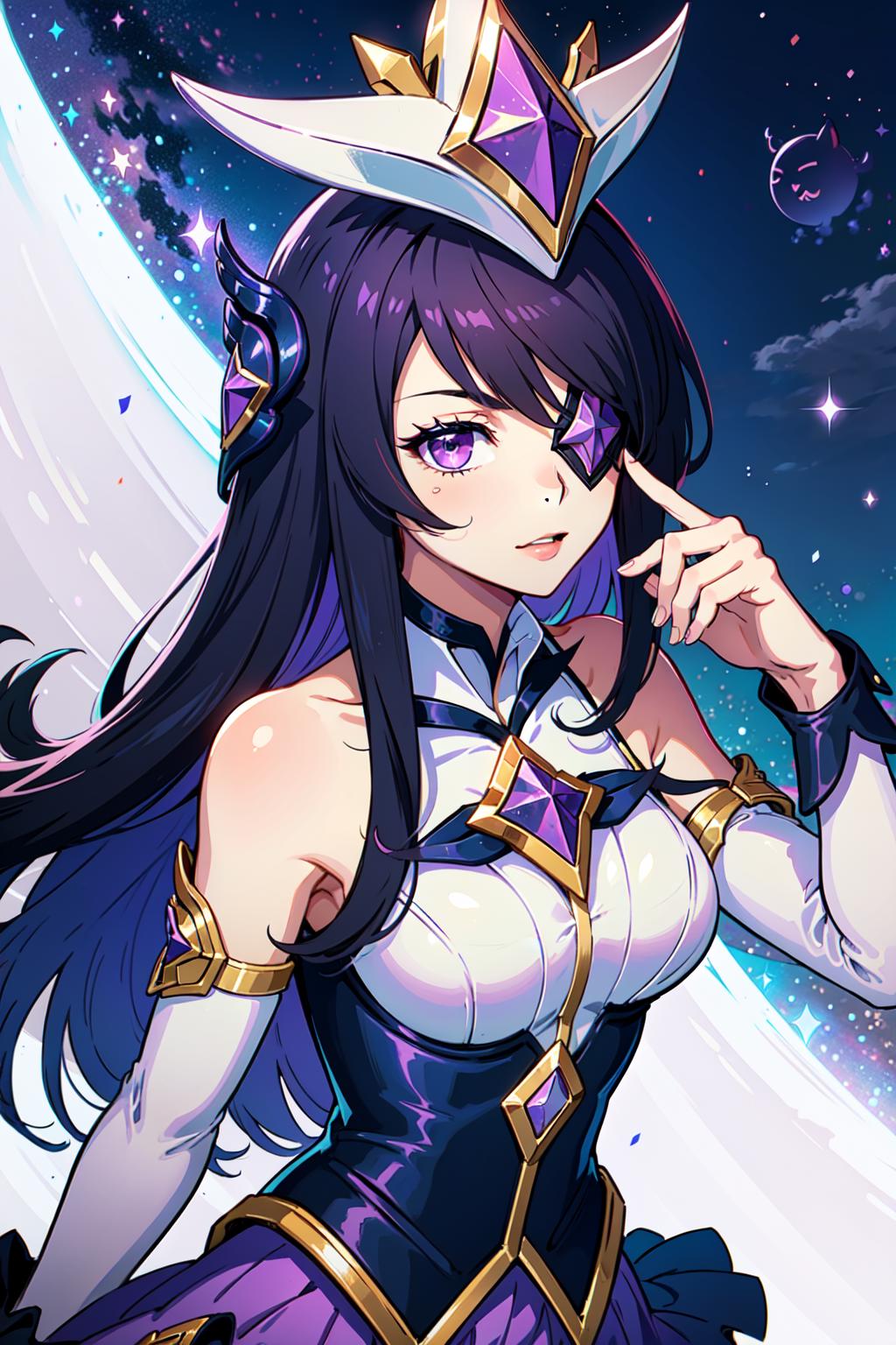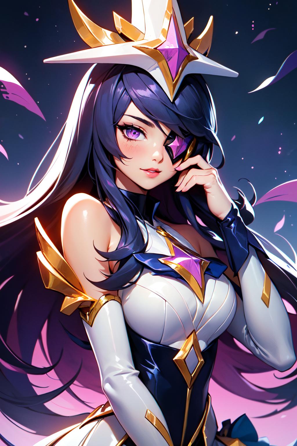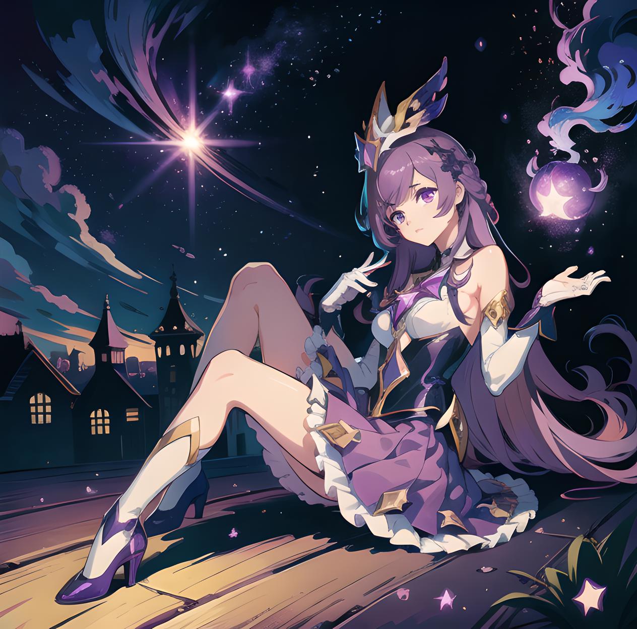 optional tags: purple hair, hair ornament, frilled skirt, dress, eyeptach