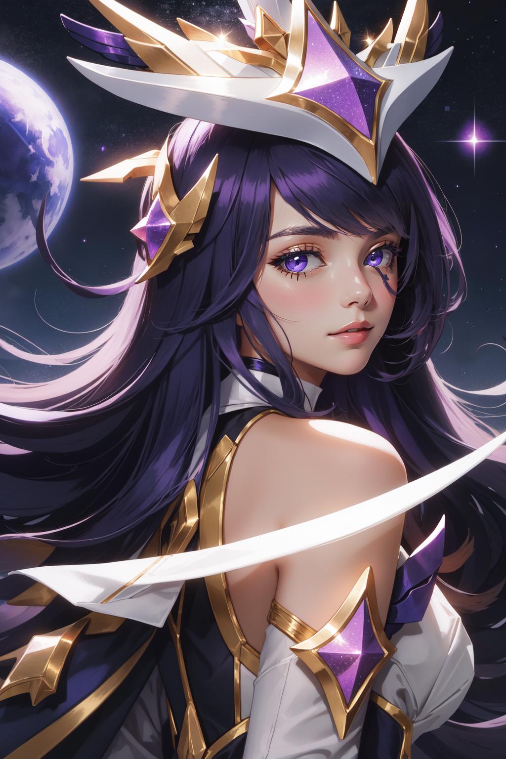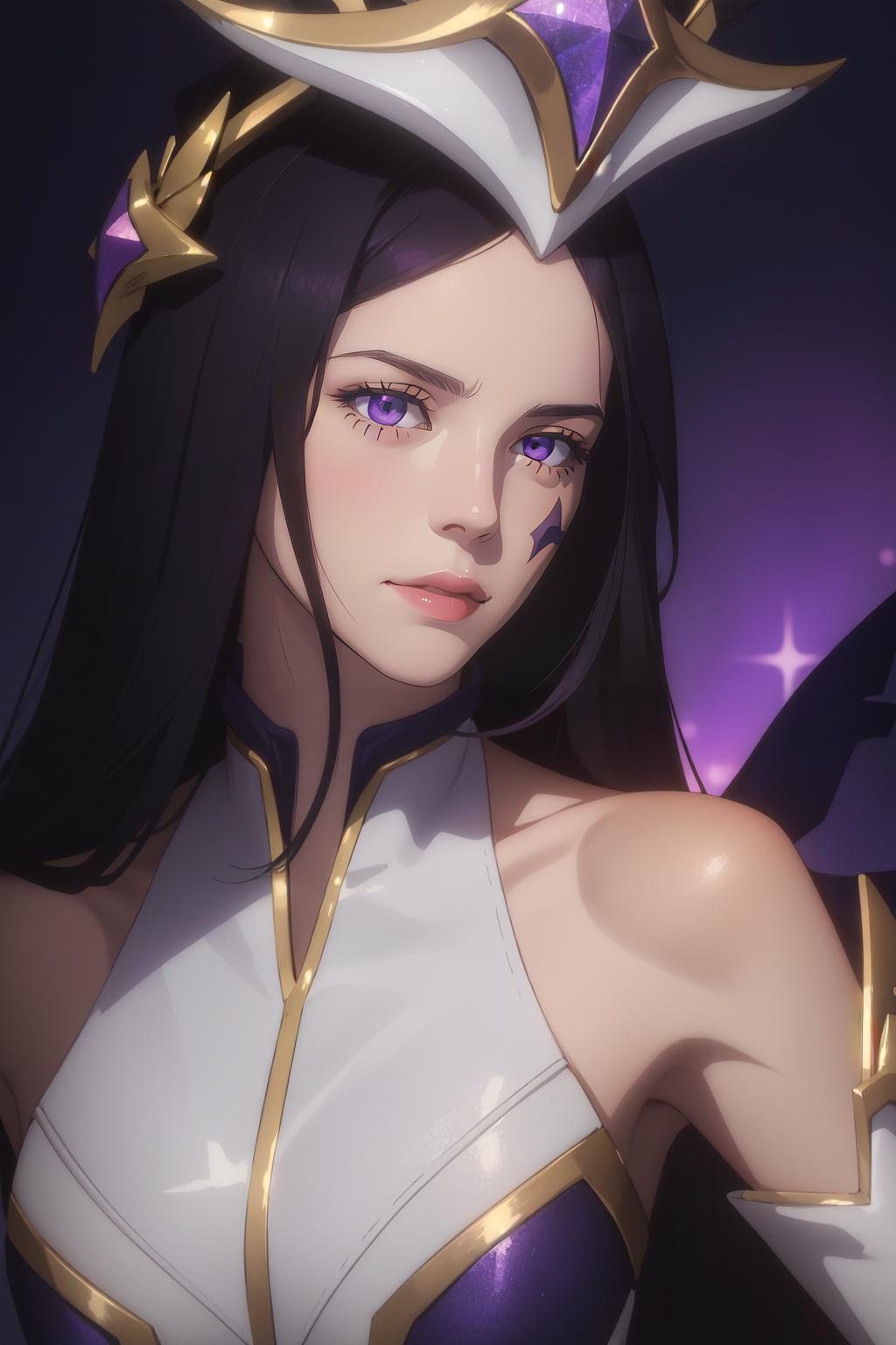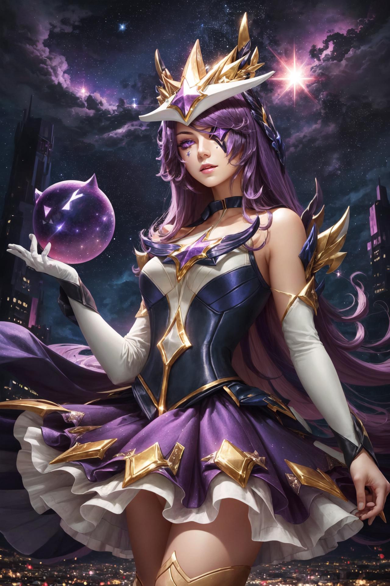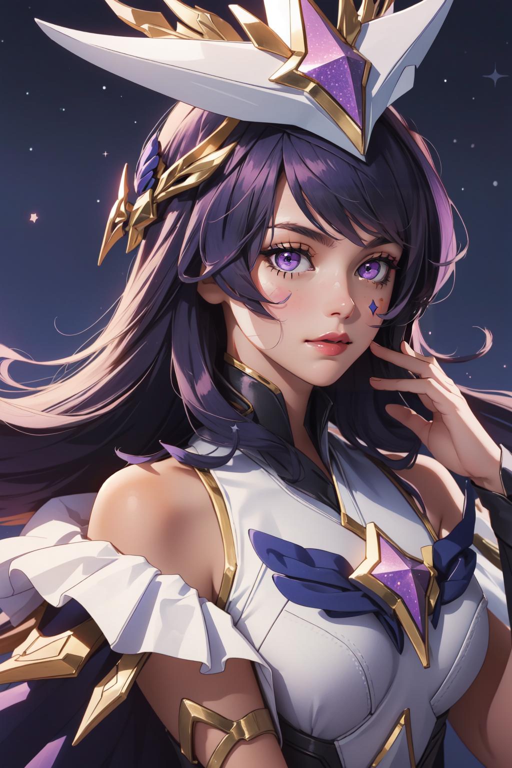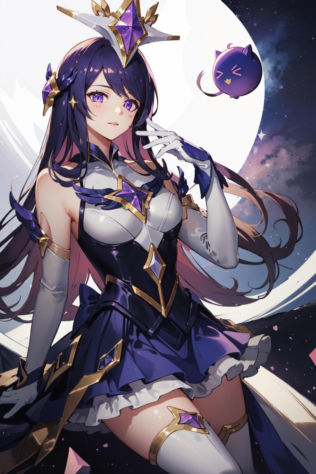 optional tags: purple hair, hair ornament, frilled skirt, dress, eyeptach