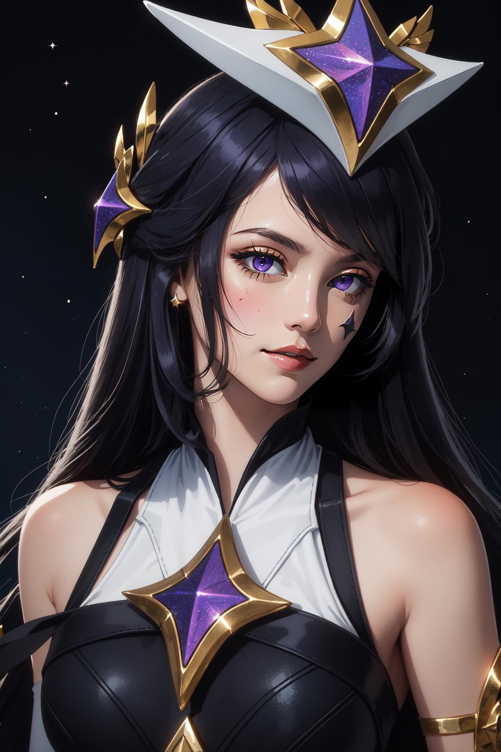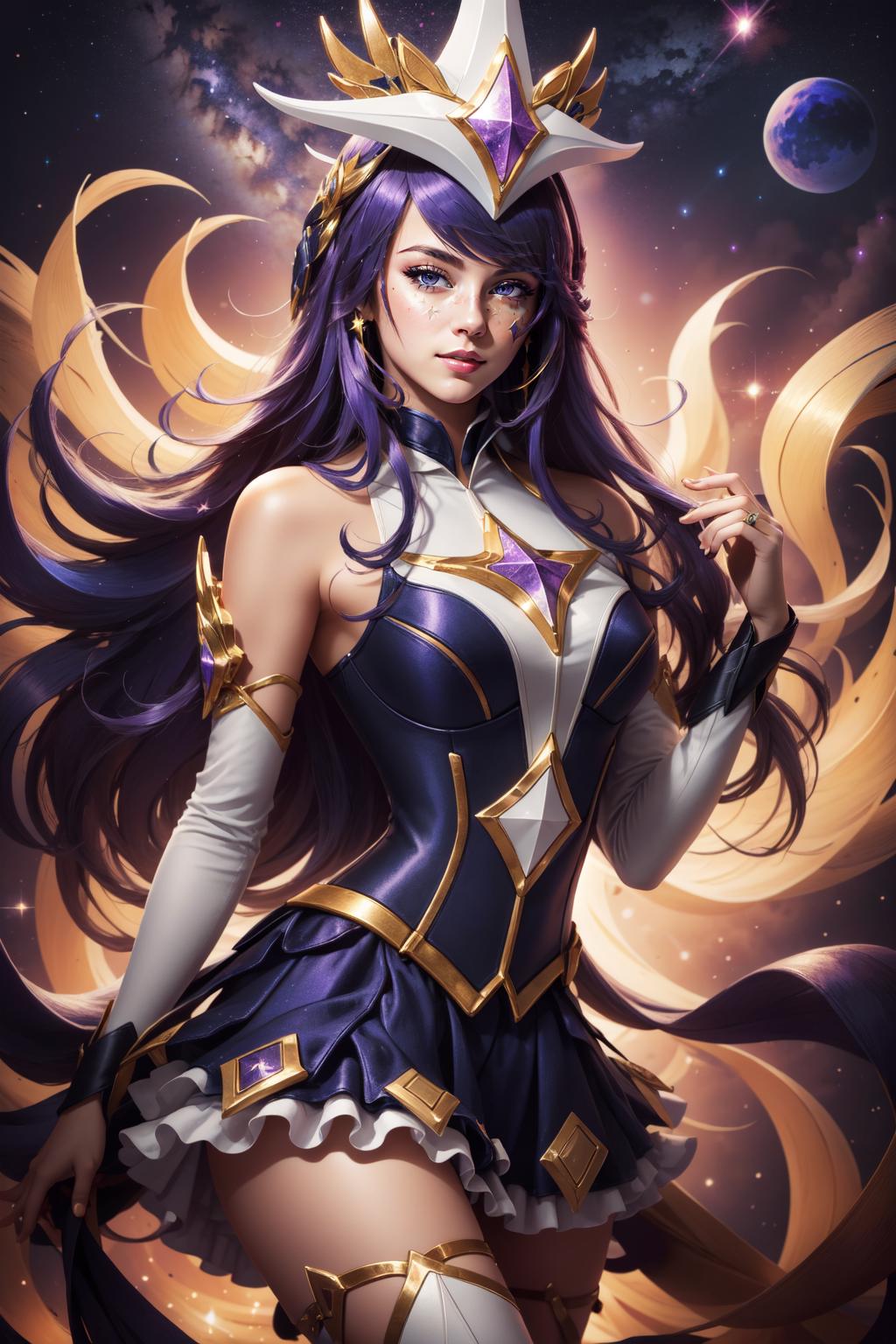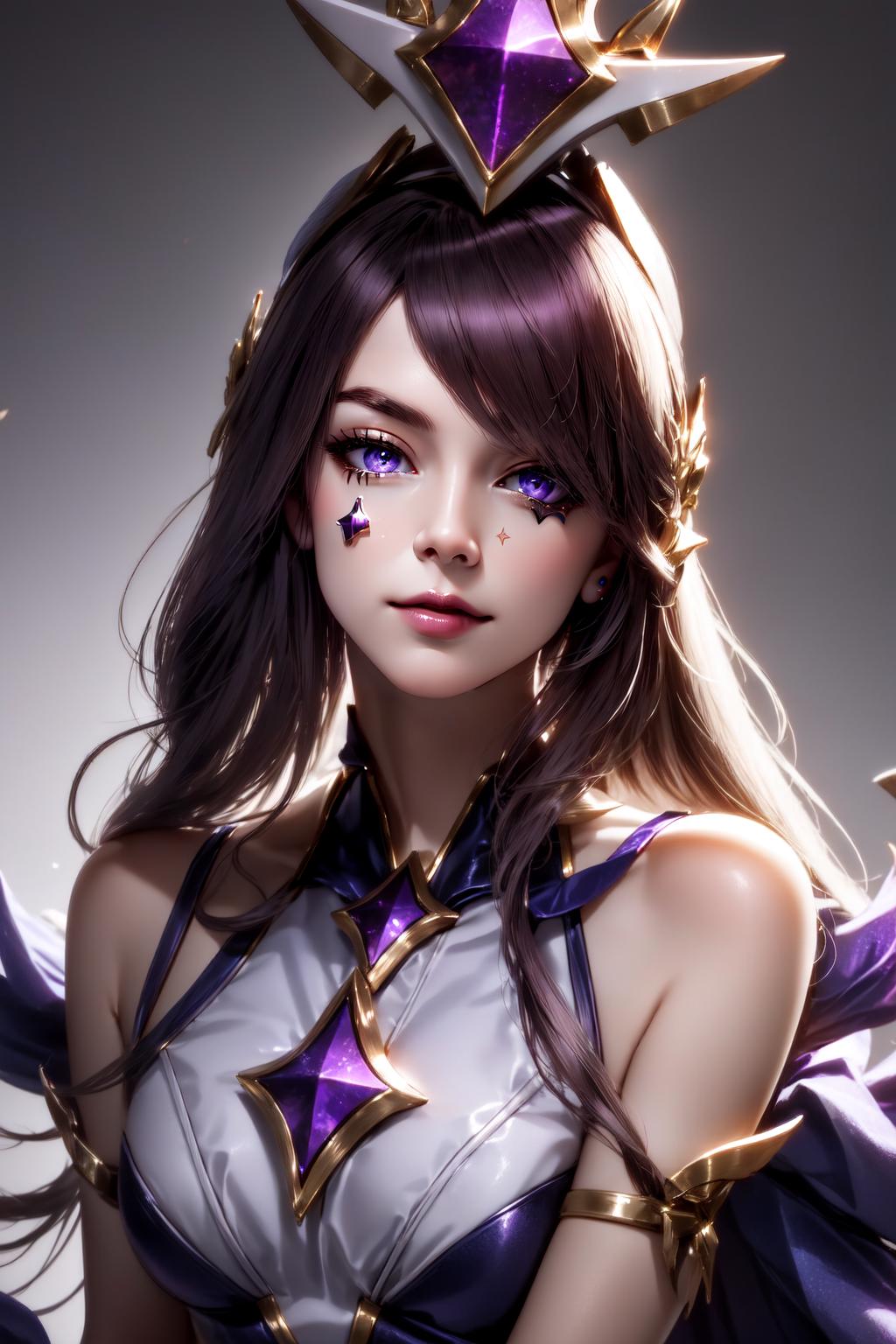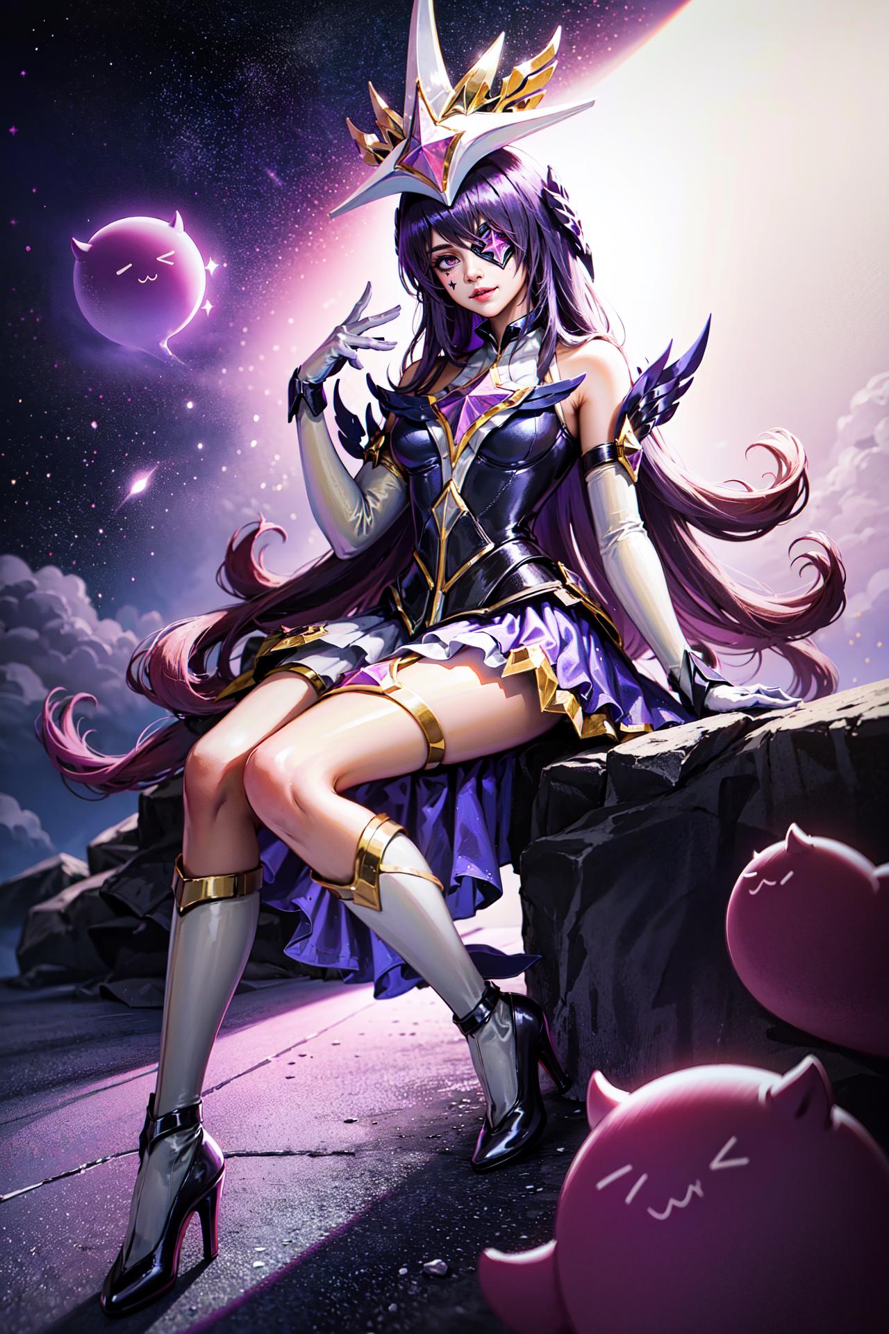 optional tags: purple hair, hair ornament, frilled skirt, dress, eyeptach